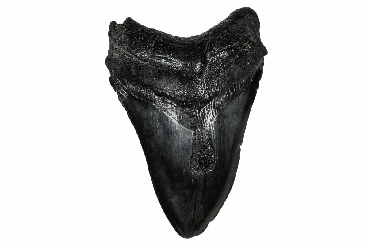 The standard measure for megalodon teeth is slant height, or the longest edge of the tooth. Adult megalodon teeth were typically in the 4 to 5 inch range: teeth over 6 inches are rare and represent super-sized individuals. Only a handful of teeth have ever been found over seven inches.