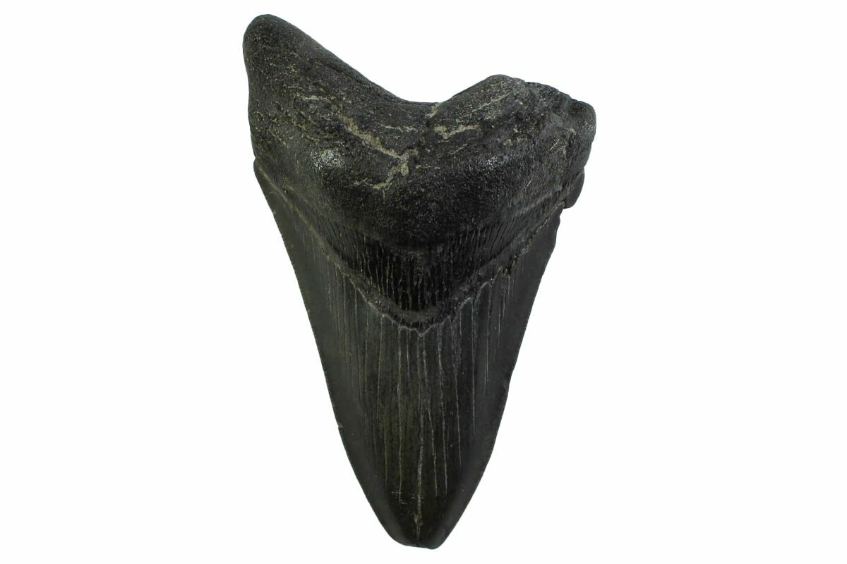 The standard measure for megalodon teeth is slant height, or the longest edge of the tooth. Adult megalodon teeth were typically in the 4 to 5 inch range: teeth over 6 inches are rare and represent super-sized individuals. Only a handful of teeth have ever been found over seven inches.