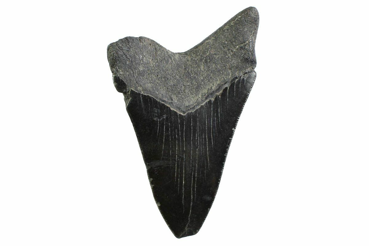 This is a 4.59" long fossil megalodon tooth collected from the Savannah River area along the border of Georgia and South Carolina. The tooth would have come from an adult, prehistoric, mega-shark in the 35+ foot size range.