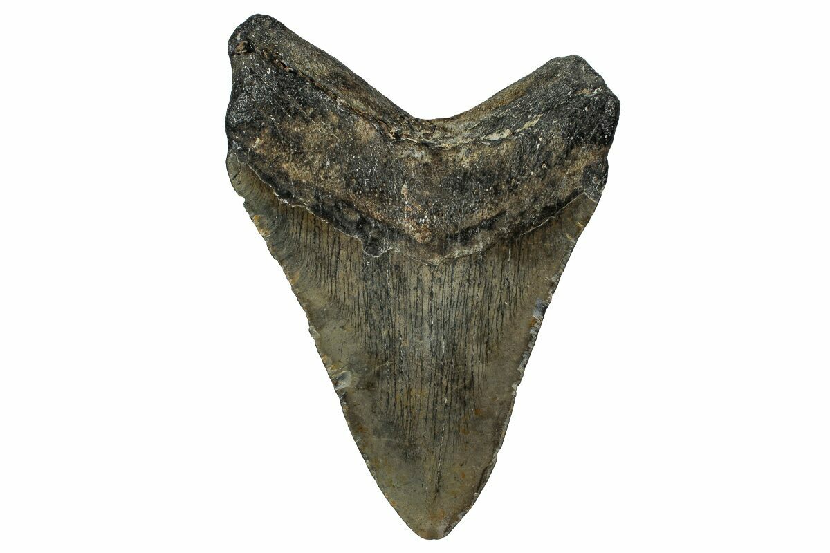 The standard measure for megalodon teeth is slant height, or the longest edge of the tooth. Adult megalodon teeth were typically in the 4 to 5 inch range: teeth over 6 inches are rare and represent super-sized individuals. Only a handful of teeth have ever been found over seven inches.