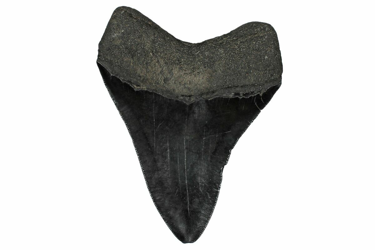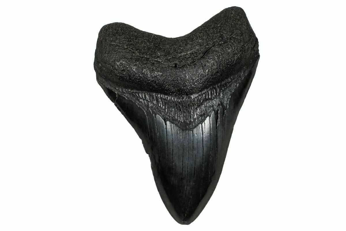 This is a 4.59" long, fossil megalodon tooth collected in South Carolina. The tooth would have come from an adult, prehistoric, mega-shark in the 35+ foot size range.