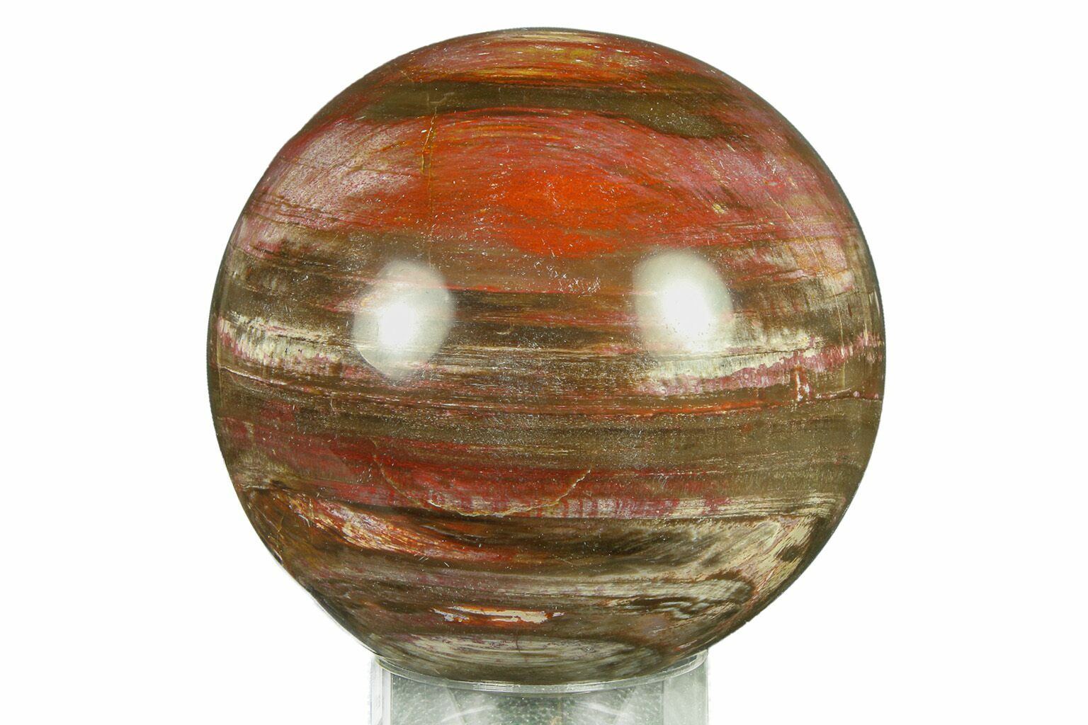 This is a colorful, 4.6" wide, polished sphere of petrified wood from Ambilobe, Madagascar. It is from the Araucaria tree, a type of conifer. The petrified wood is from the early Triassic period, approximately 220 million years old, close to the time the first dinosaurs appeared on the planet.