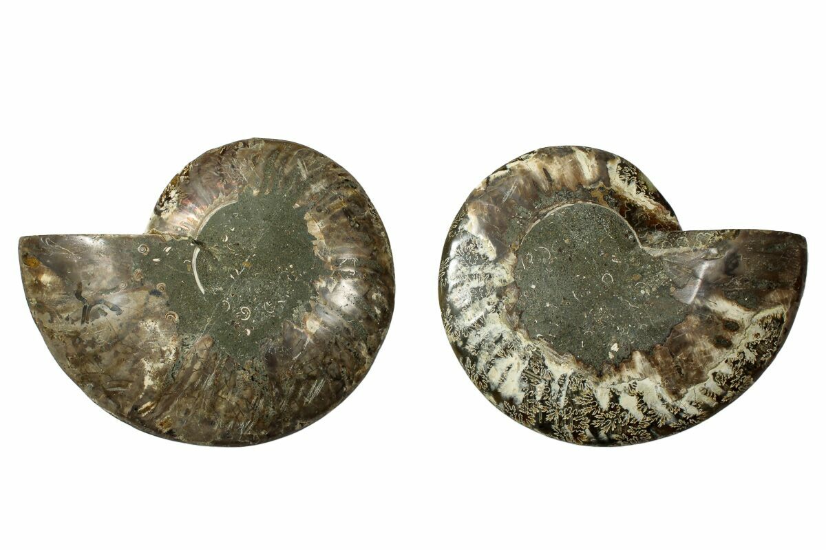 It exhibits gorgeous mineralization within the chambers, each separated by white calcite septa (divisions). This highly polished exotic ammonite makes a superb display piece with tremendous historical appeal.