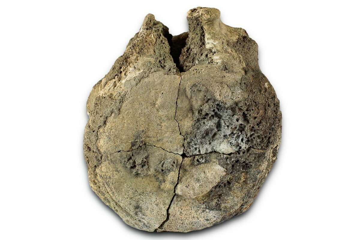 This is a beefy, 4.6" tall fossil Triceratops vertebra centrum, collected from the Hell Creek Formation in Dawson County, Montana. There are a couple repaired cracks through the bone, with a fairly large chunk of the centrum missing along this repair.