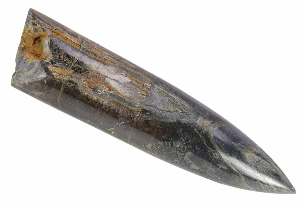 This is a fossil rostrum from a belemnite (Cylindroteuthis) collected from a Middle Jurassic aged marine deposit in Northamptonshire, England. It's quite large, has undergone partial pyrite replacement, and is nicely intact with no repair.
