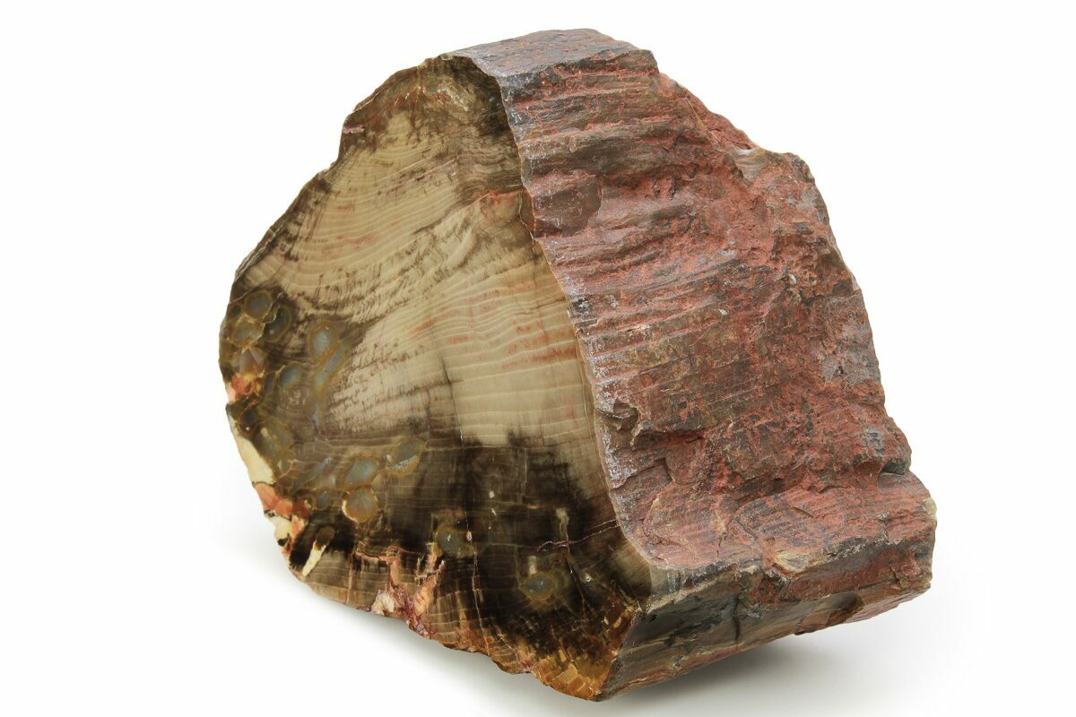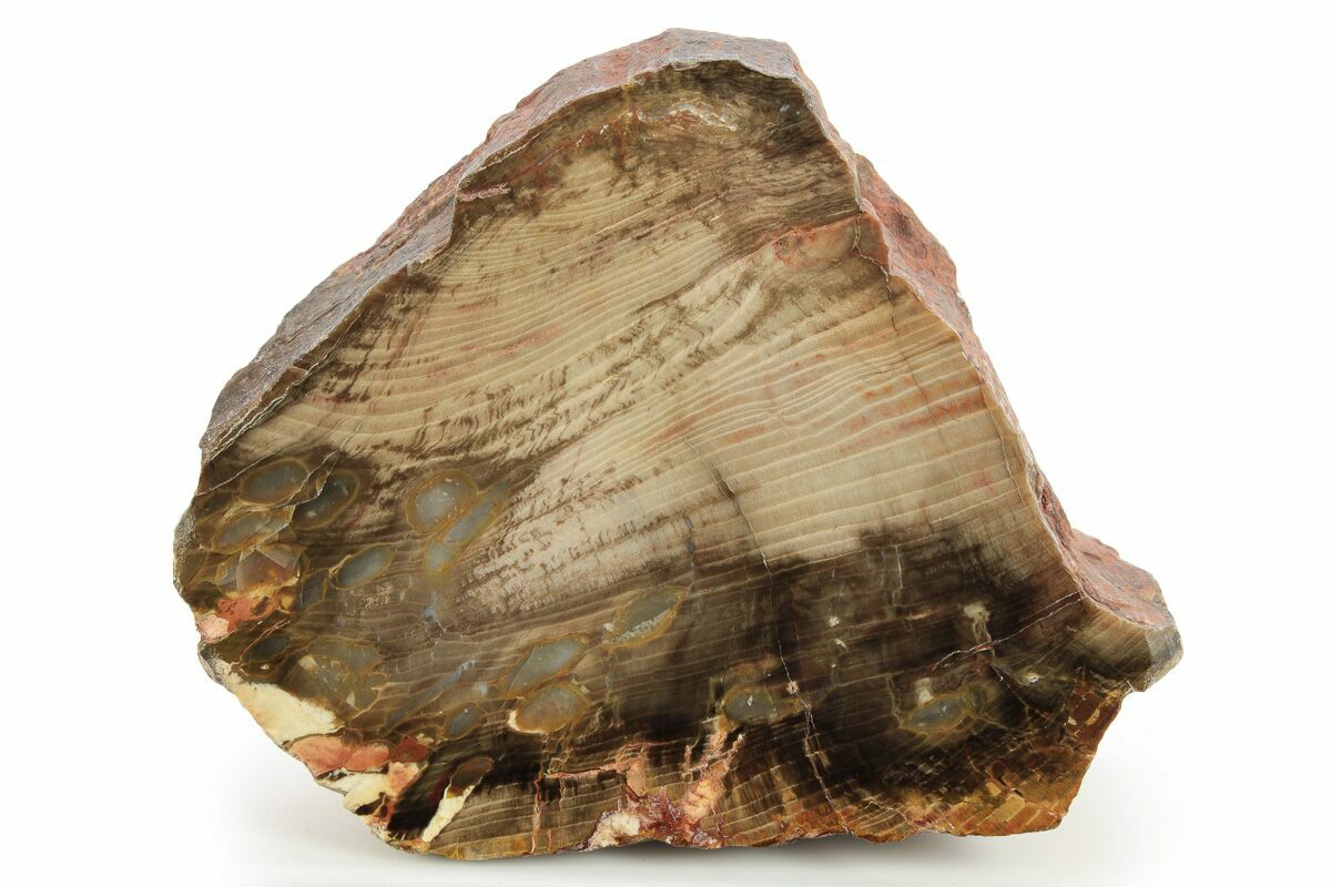 This is a 4.6" polished section of petrified wood (Conifer) from Australia, known as "Peanut Wood". It is actually petrified driftwood that is full of boreholes from clam larvae of the genus Teredo, commonly know as shipworms. These boreholes were filled in by a white mineral during the fossilization process, giving this petrified wood its unique appearance. The wood itself is from Aruacaria, a type of conifer and is Lower Cretaceous in age, or approximately 113 million years old.