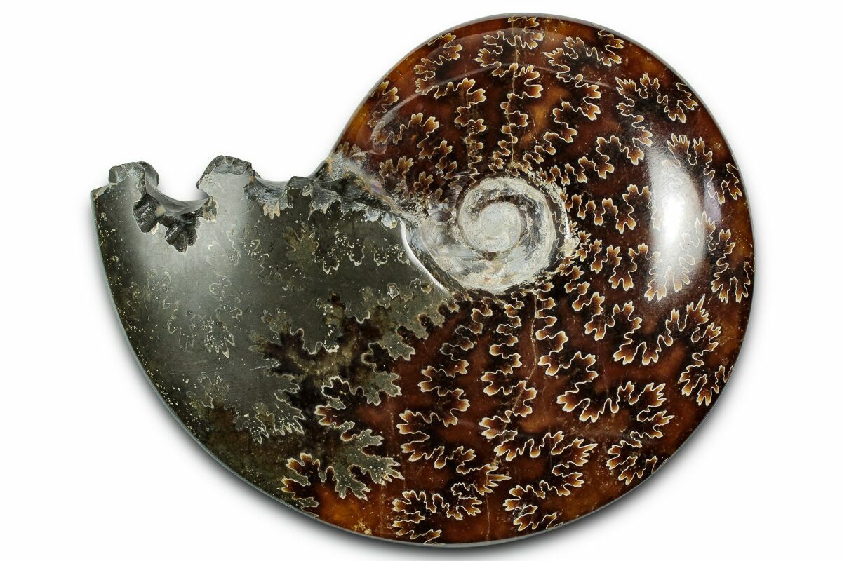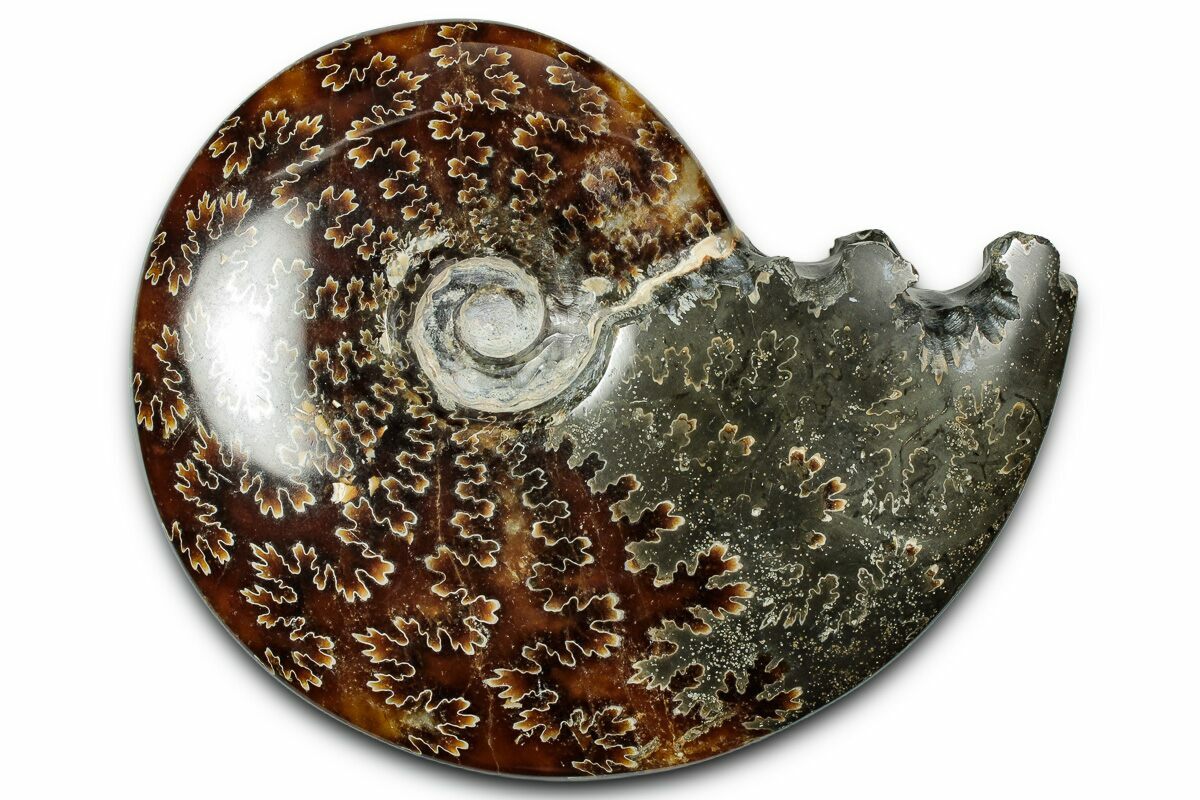 This is a 4.6" wide polished ammonite of the genus Cleoniceras, collected in Madagascar. It is absolutely gorgeous, displaying a distinctive "oak-leaf" suture pattern on the surface. This 110 million year old ammonite is truly a natural work of art, with the end chamber having been exposed/cleaned.