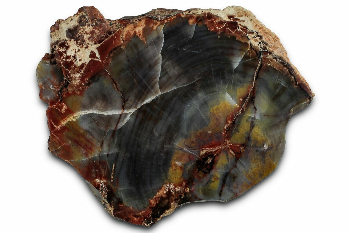 This is a brilliantly colored, 4.6" wide section of petrified wood (Araucarioxylon) from Arizona. One side of the petrified has been polished to a glossy finish, while the exterior surface has a natural texture.