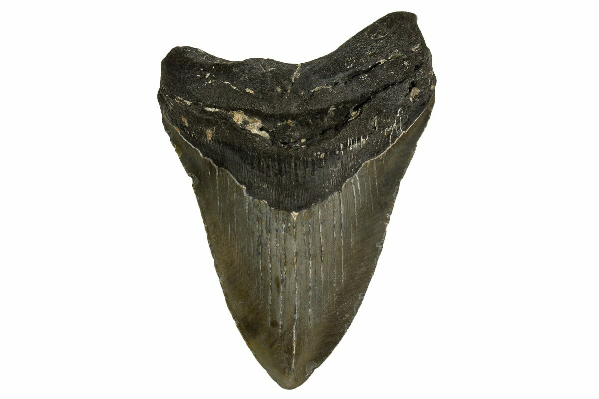 The standard measure for megalodon teeth is slant height, or the longest edge of the tooth. Adult megalodon teeth were typically in the 4 to 5 inch range: teeth over 6 inches are rare and represent super-sized individuals. Only a handful of teeth have ever been found over seven inches.