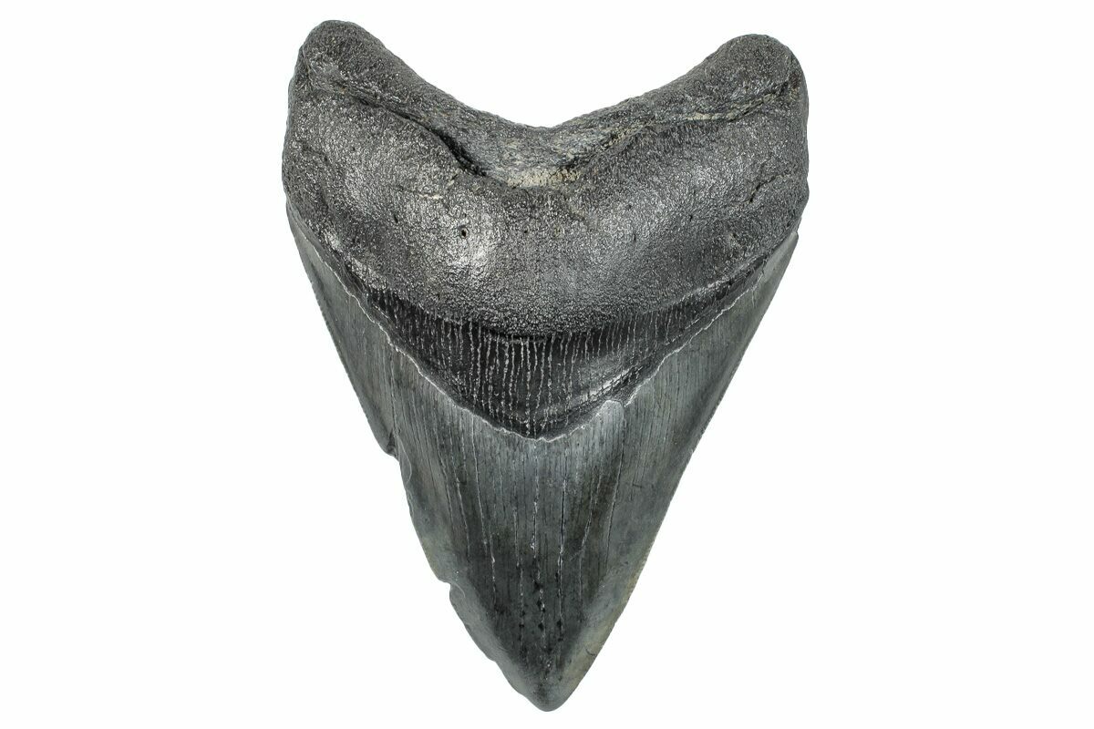 The standard measure for megalodon teeth is slant height, or the longest edge of the tooth. Adult megalodon teeth were typically in the 4 to 5 inch range: teeth over 6 inches are rare and represent super-sized individuals. Only a handful of teeth have ever been found over seven inches.