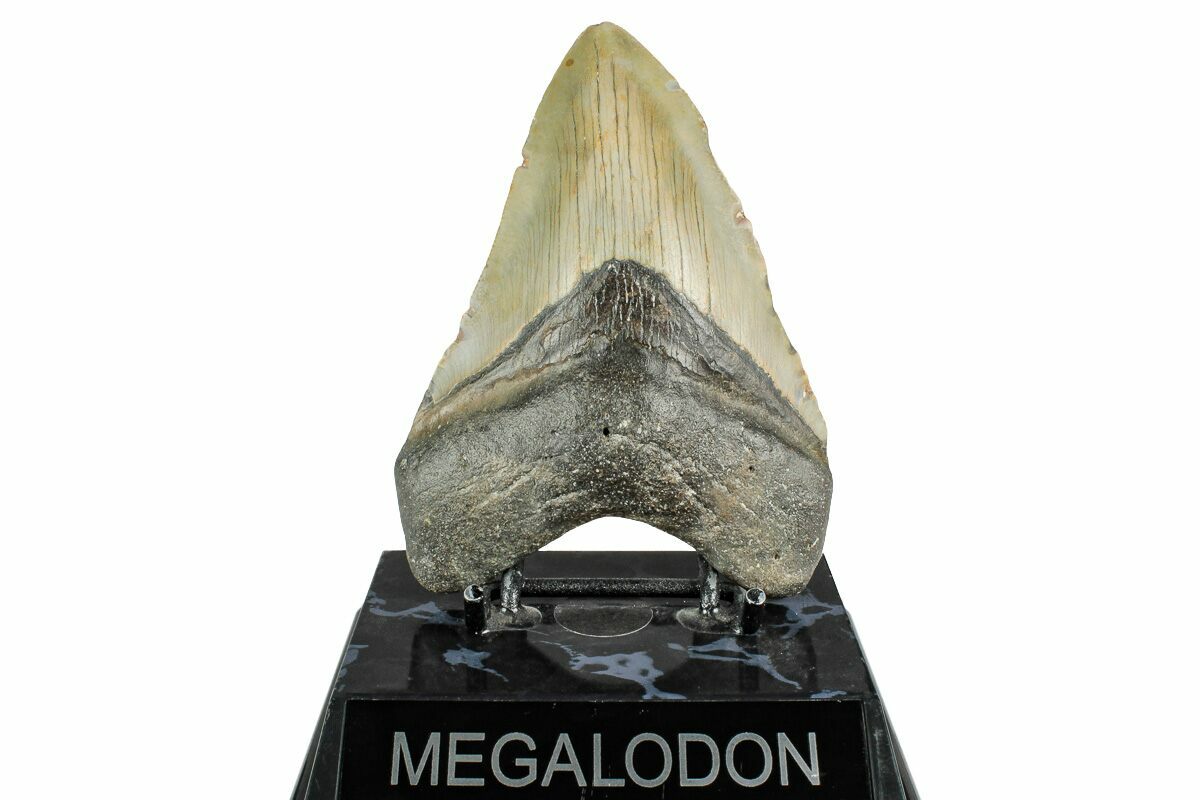 The standard measure for megalodon teeth is slant height, or the longest edge of the tooth. Adult megalodon teeth were typically in the 4 to 5 inch range: teeth over 6 inches are rare and represent super-sized individuals. Only a handful of teeth have ever been found over seven inches.
