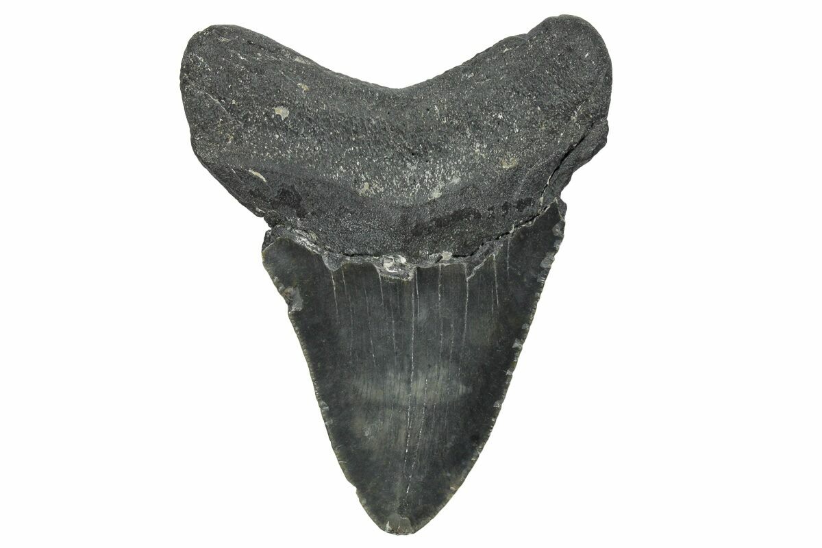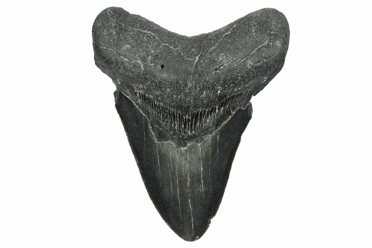 The standard measure for megalodon teeth is slant height, or the longest edge of the tooth. Adult megalodon teeth were typically in the 4 to 5 inch range: teeth over 6 inches are rare and represent super-sized individuals. Only a handful of teeth have ever been found over seven inches.