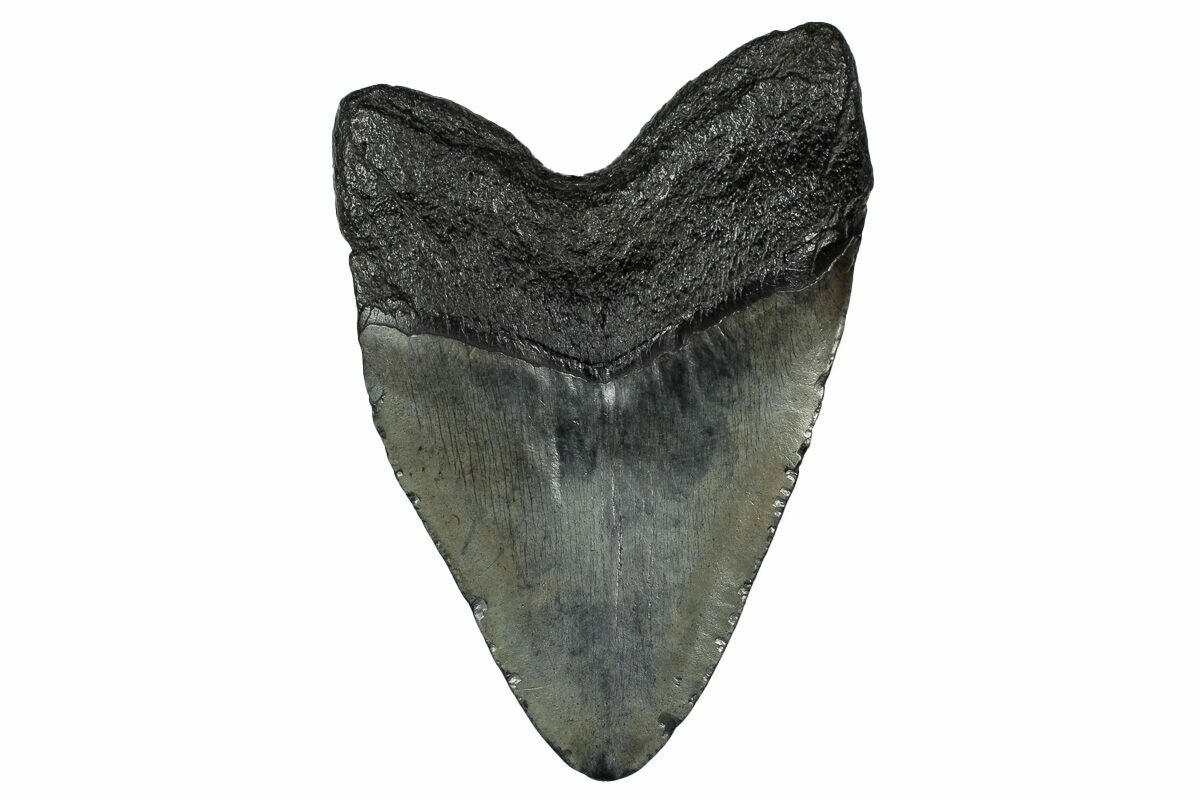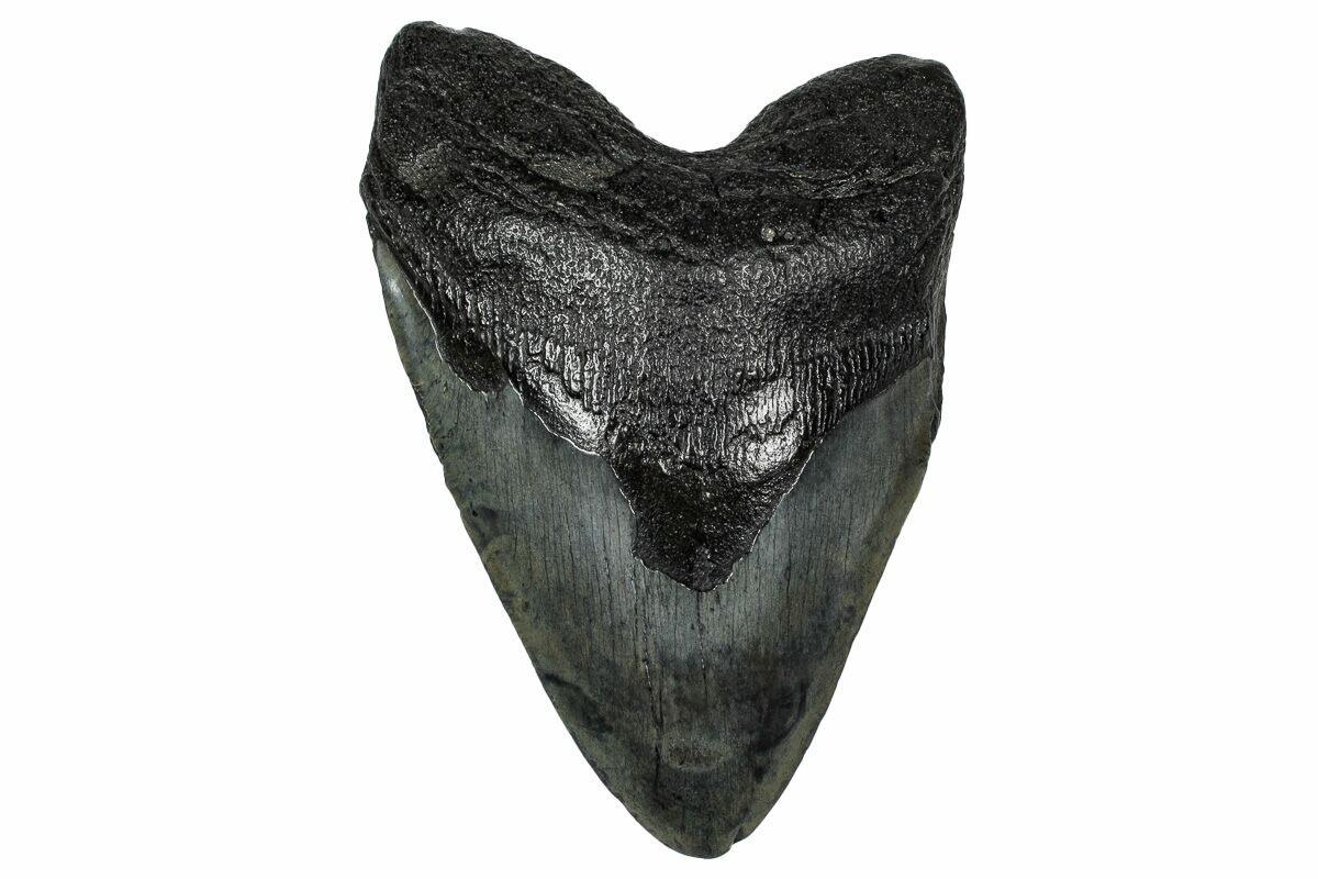 This is a 4.64" long, fossil megalodon tooth collected in South Carolina. The tooth would have come from an adult, prehistoric, mega-shark in the 35+ foot size range.
