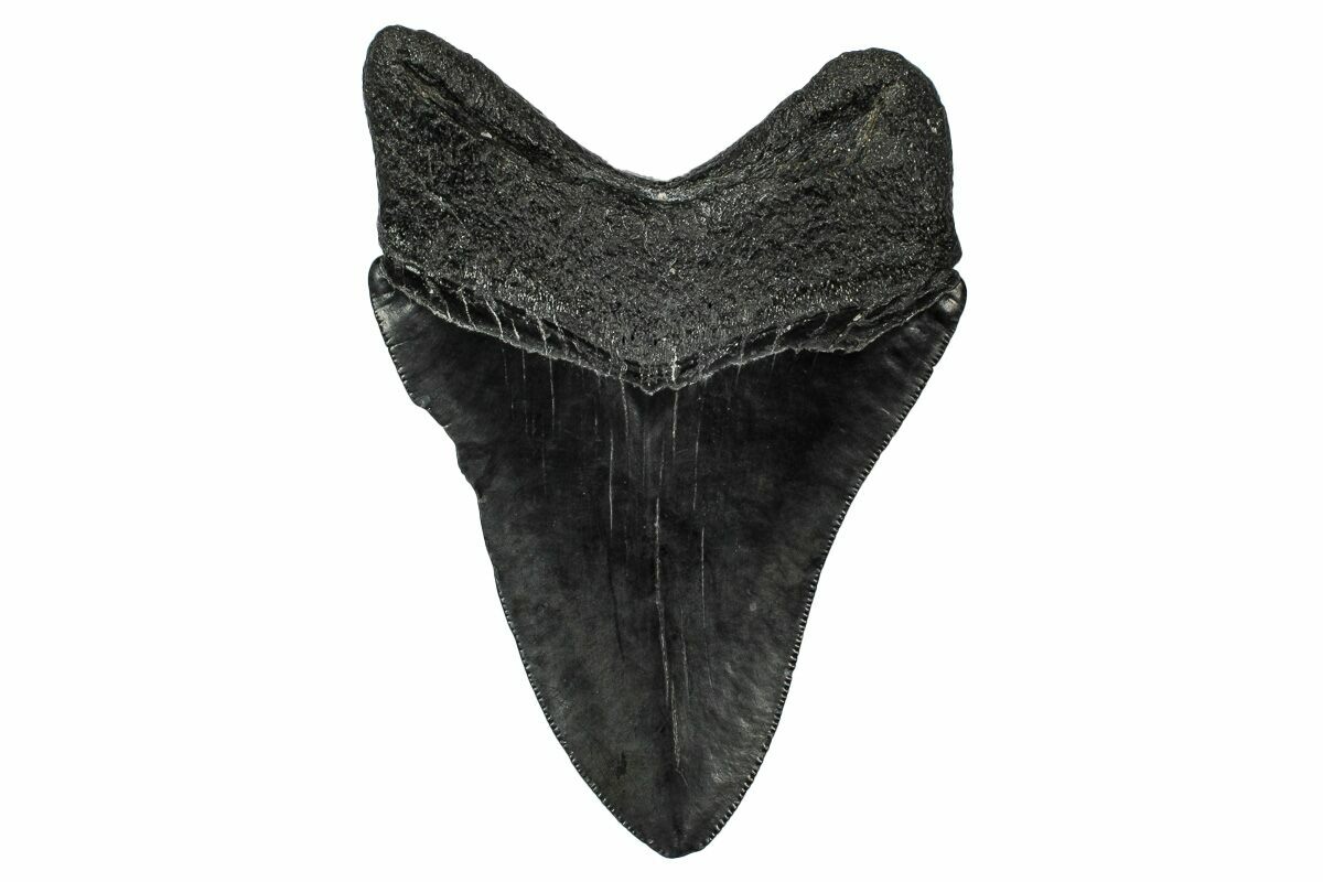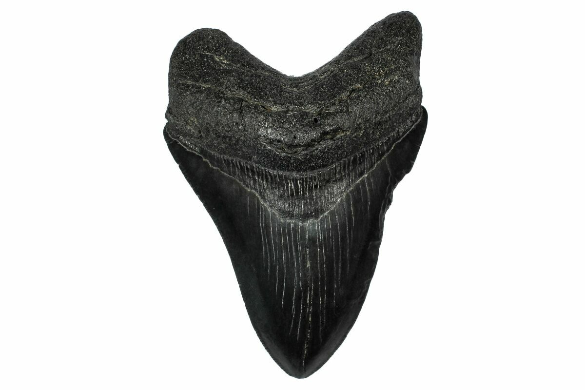 The standard measure for megalodon teeth is slant height, or the longest edge of the tooth. Adult megalodon teeth were typically in the 4 to 5 inch range: teeth over 6 inches are rare and represent super-sized individuals. Only a handful of teeth have ever been found over seven inches.