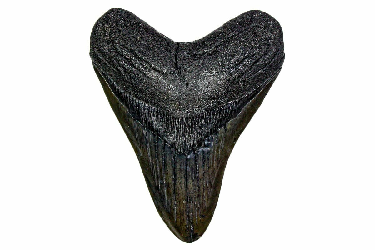 The standard measure for megalodon teeth is slant height, or the longest edge of the tooth. Adult megalodon teeth were typically in the 4 to 5 inch range: teeth over 6 inches are rare and represent super-sized individuals. Only a handful of teeth have ever been found over seven inches.