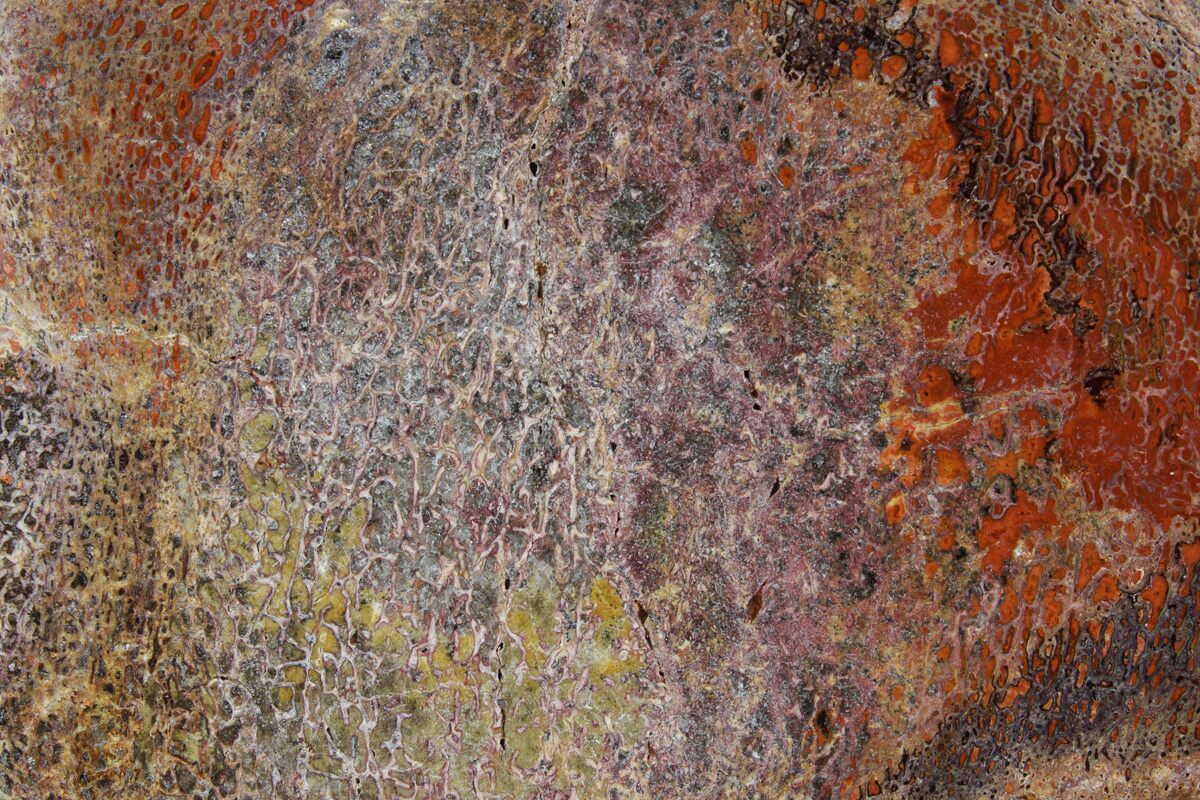 Dinosaur gembone (agatized dinosaur bone) forms when the porous structure of dinosaur bone is replaced by silica-rich minerals like agate, chalcedony, or jasper. This preserves the bone’s internal cell patterns, creating striking, web-like textures visible when polished.