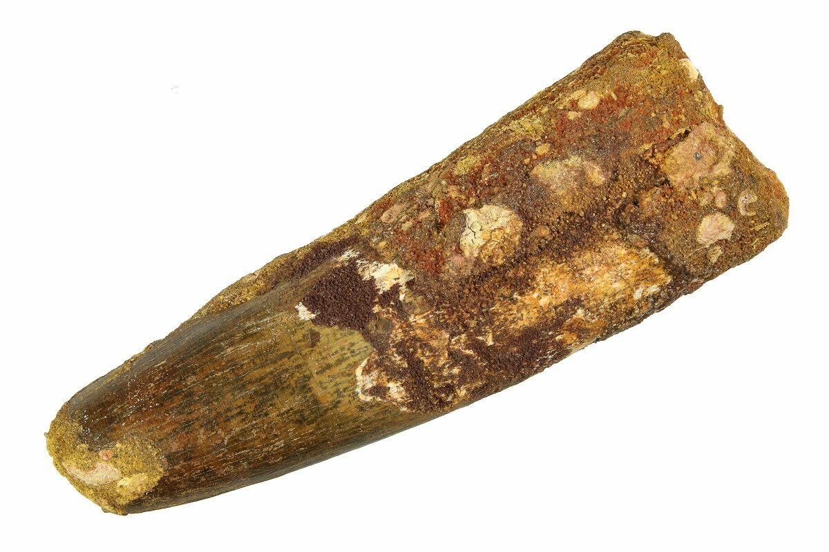 Spinosaurus teeth are relatively common fossils, but large (3+ inches), well-preserved examples are rare. These large Spinosaurus teeth will often be heavily doctored. We’ve seen many examples where multiple partial teeth can been glued to together to create a larger fake tooth, or where enamel has been painted on. One giveaway to look for is a ring of sand around the middle of the tooth, usually glued on to hide a break. Sometimes this is a sign that multiple partial teeth have been composited, but other times it is used to disguise a badly done repair job.