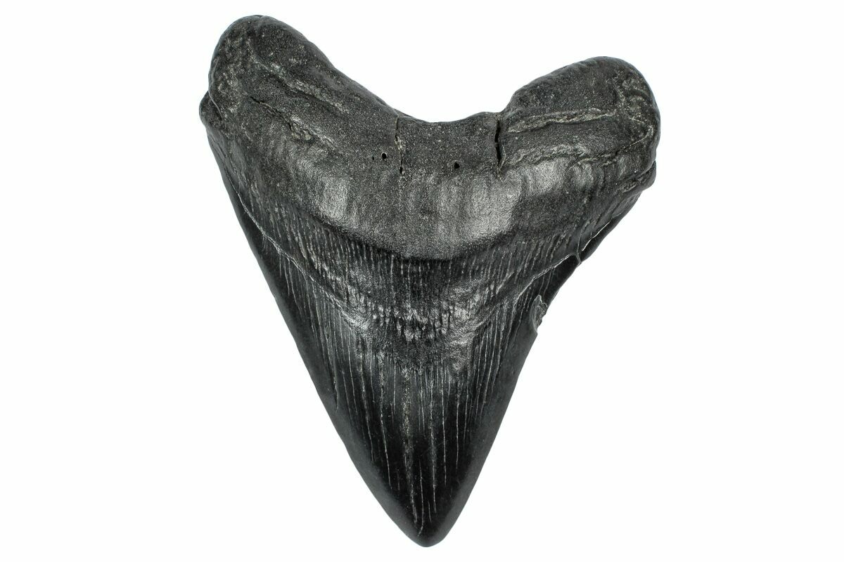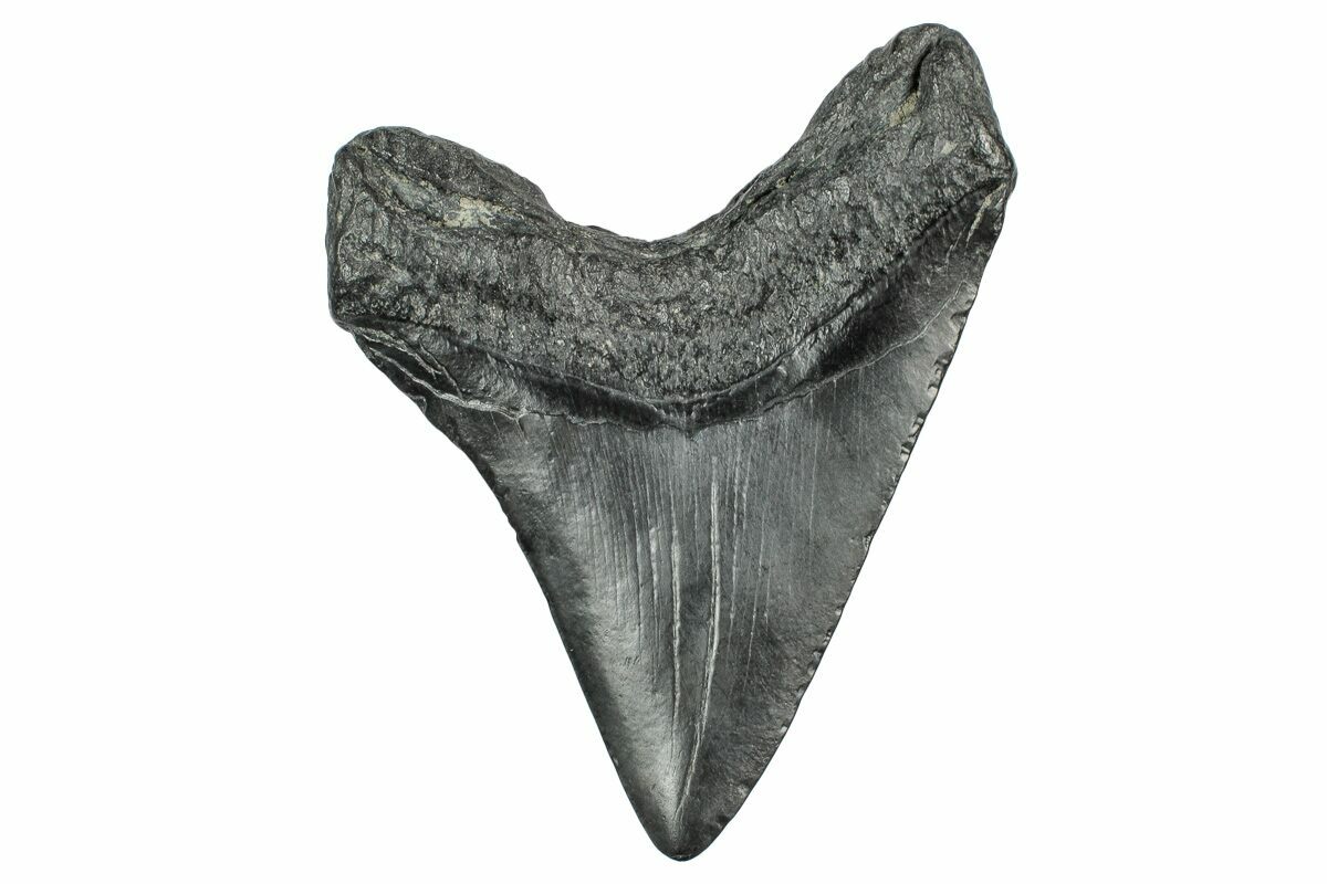 The standard measure for megalodon teeth is slant height, or the longest edge of the tooth. Adult megalodon teeth were typically in the 4 to 5 inch range: teeth over 6 inches are rare and represent super-sized individuals. Only a handful of teeth have ever been found over seven inches.