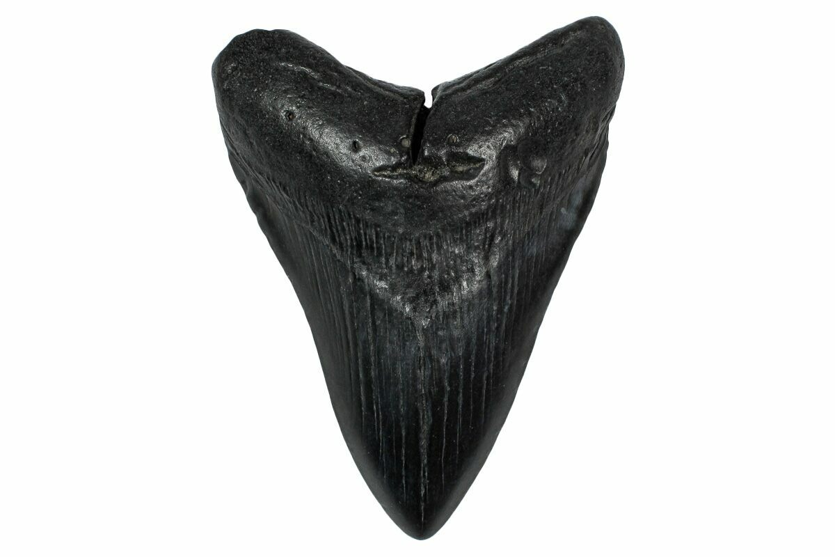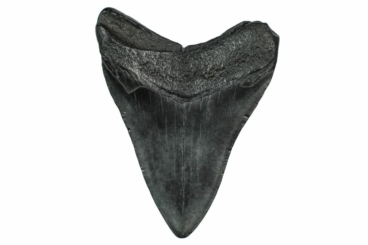This is a 4.67" long, fossil megalodon tooth collected in South Carolina. The tooth would have come from an adult, prehistoric, mega-shark in the 35+ foot size range.