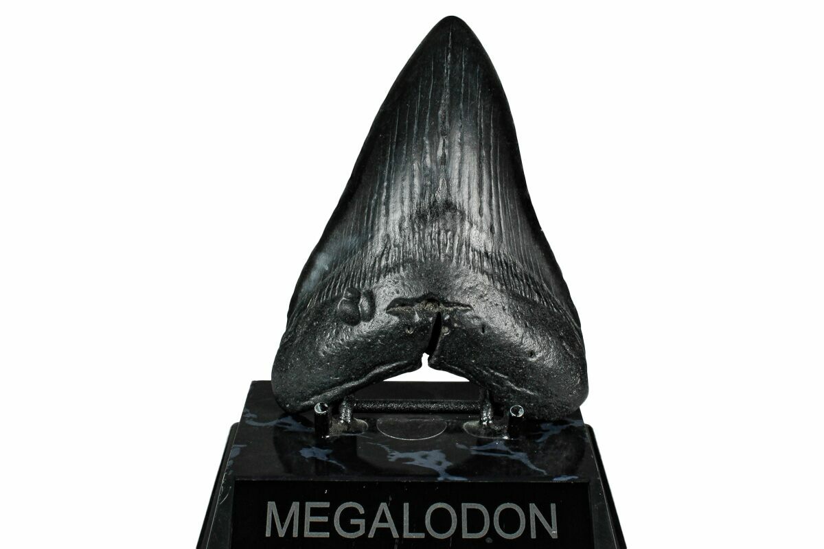 The standard measure for megalodon teeth is slant height, or the longest edge of the tooth. Adult megalodon teeth were typically in the 4 to 5 inch range: teeth over 6 inches are rare and represent super-sized individuals. Only a handful of teeth have ever been found over seven inches.