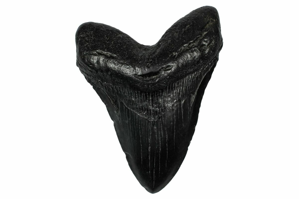 This is a 4.69" long, fossil megalodon tooth collected in South Carolina. The tooth would have come from an adult, prehistoric, mega-shark in the 35+ foot size range.