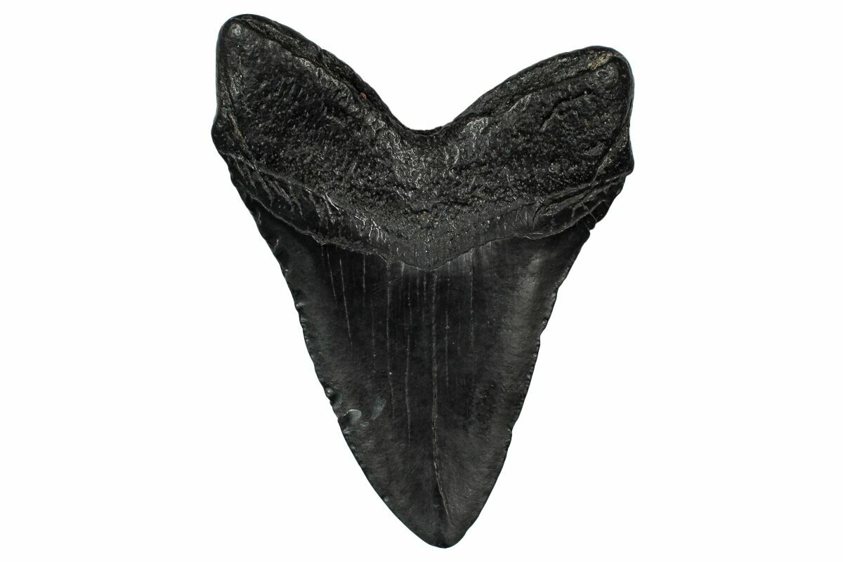 The standard measure for megalodon teeth is slant height, or the longest edge of the tooth. Adult megalodon teeth were typically in the 4 to 5 inch range: teeth over 6 inches are rare and represent super-sized individuals. Only a handful of teeth have ever been found over seven inches.