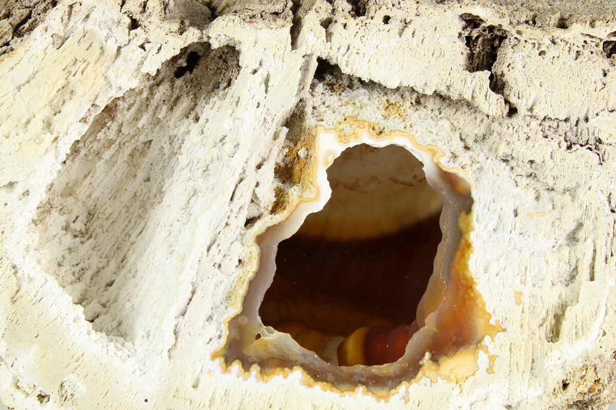 What we have for you is a spectacular specimen of agatized coral from the Basin Deposits of Florida. This fossil coral is Miocene (25-32 million years) in age, and was formed when fine sediments covered shallow coral reefs. As silica-rich groundwater seeped through rock that became exposed as sea levels dropped, it replaced the calcium carbonate skeleton of the coral with chalcedony. While exact identification is difficult to pinpoint, this specimen exhibits structures consistent with rugose coral. Agate-filled portions of these coral specimens may glow a phantasmal white-green under short-wave UV light.