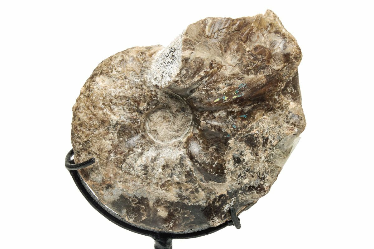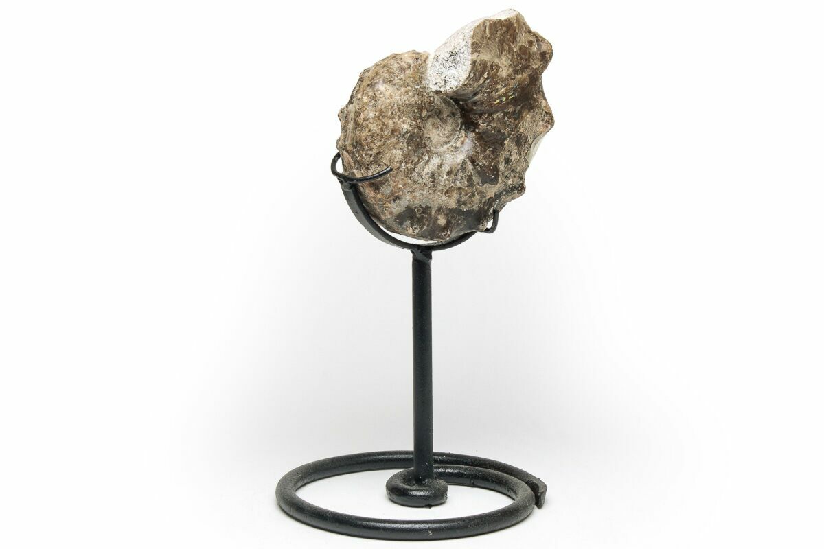 This ammonite comes with the pictured custom metal display stand. When on the stand, this specimen is about 9.25" tall.