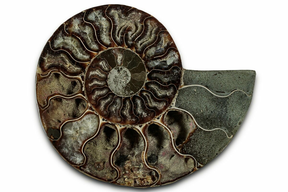 Here is a beautiful, 4.7" wide, cut and polished Cleoniceras ammonite fossil from Madagascar. These ammonites are Cretaceous in age, approximately 110 million years old. This specimen exhibits gorgeous mineralization within the chambers, each separated by white calcite septa (divisions). This highly polished, exotic ammonite makes a superb display piece with tremendous historical appeal.