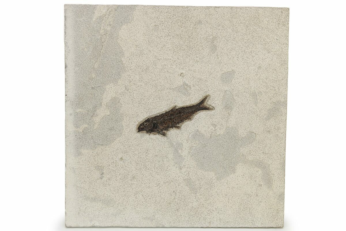 This 4.7" long fossil fish (Knightia eocaena) from the Eocene-age Green River Formation in Wyoming. It is well-detailed and prepared with bone structure, fins, and some scale structure visible. It's nicely centered on a rectangular slab of shale.