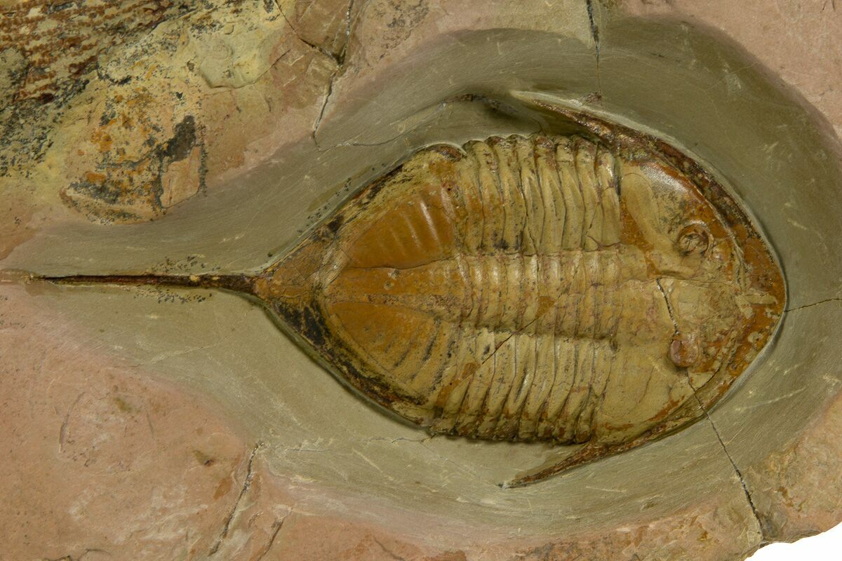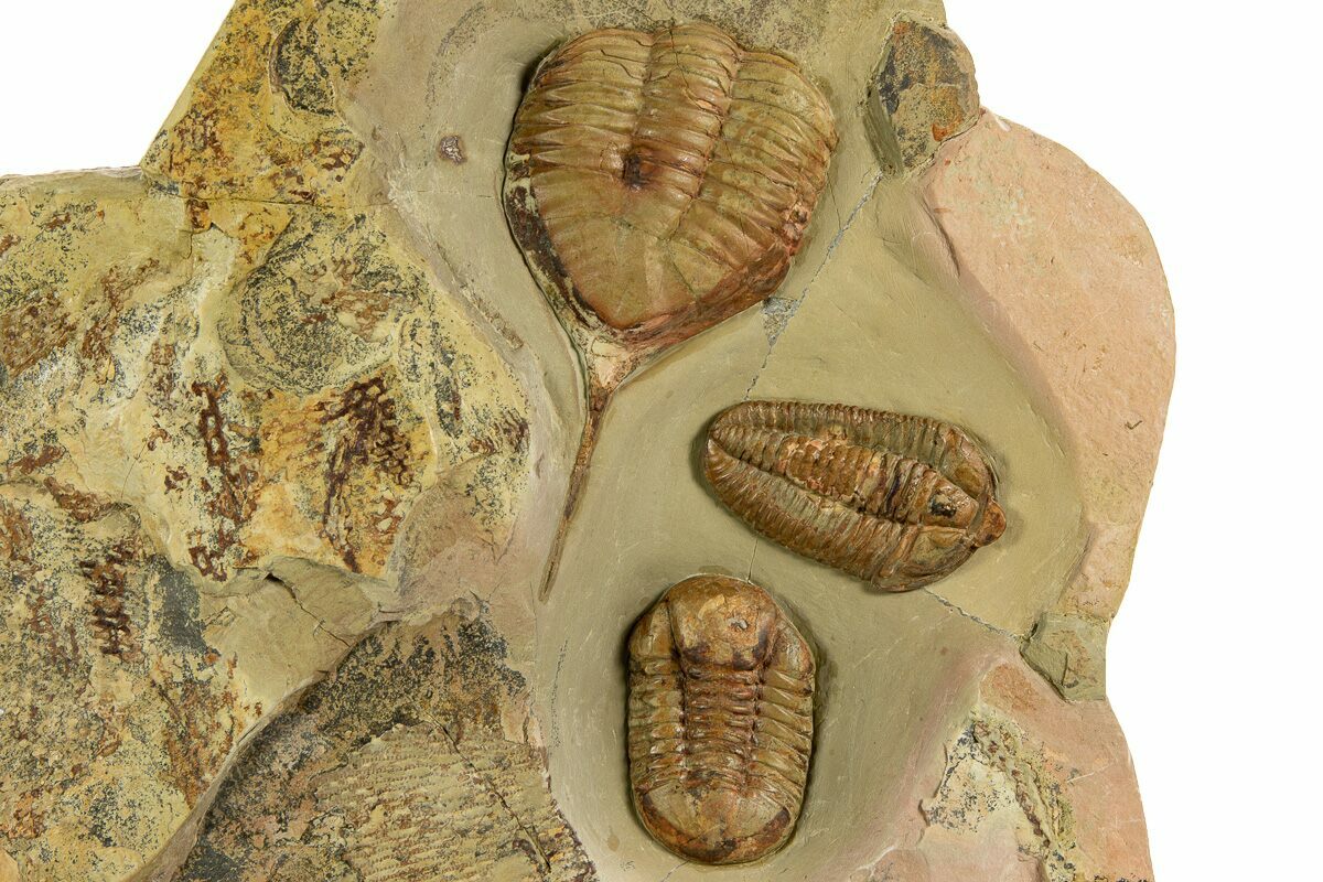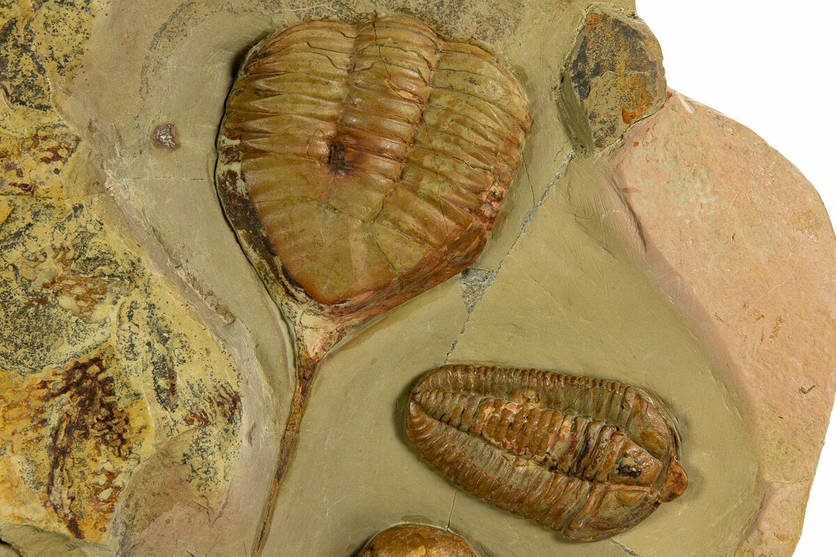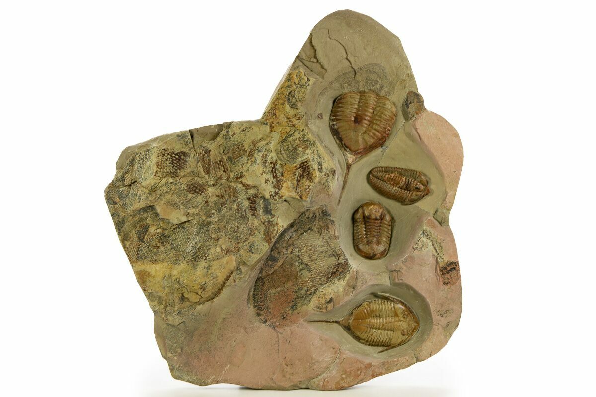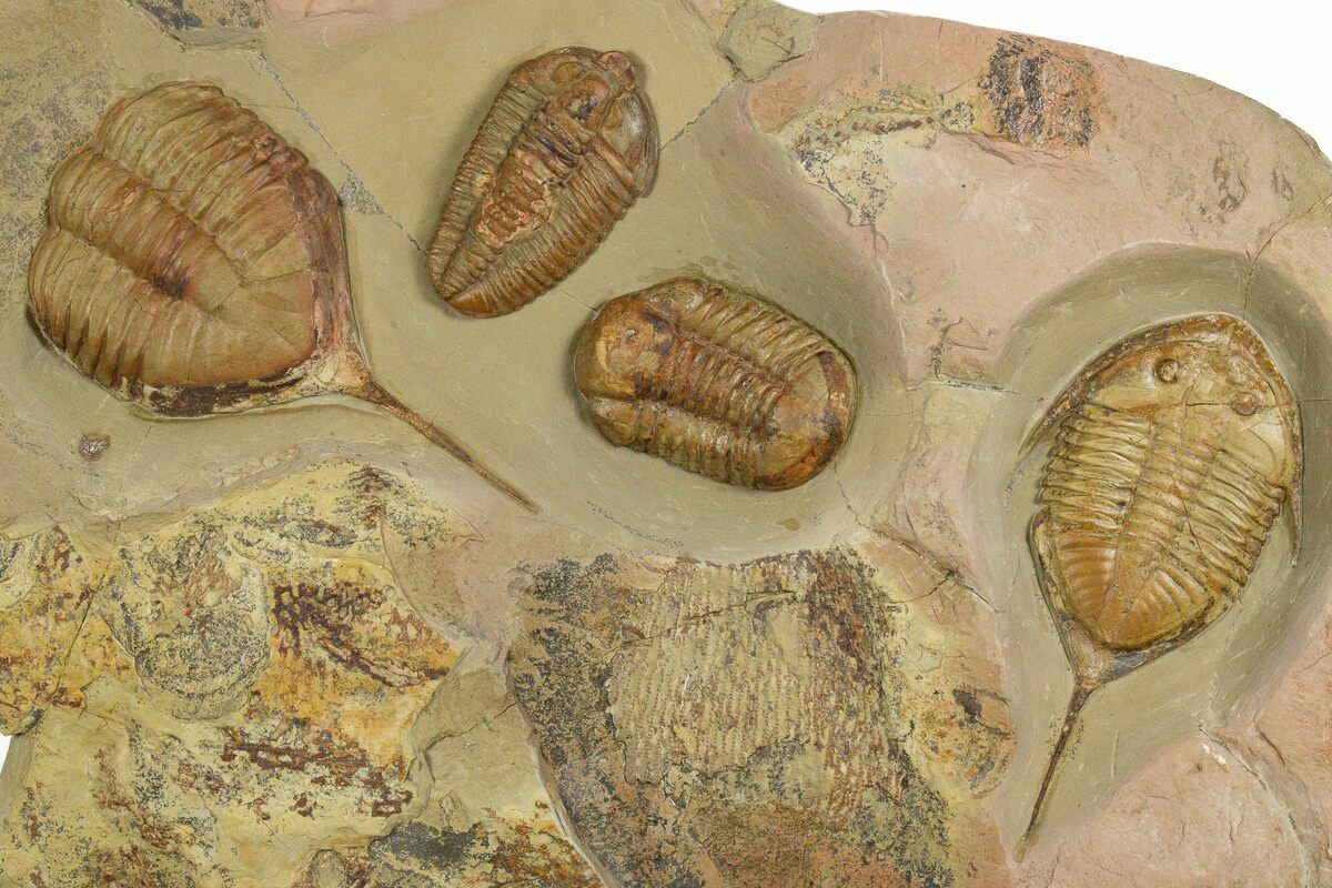 This is a beautiful, 4.7" long Megistaspis trilobite preserved alongside two additional trilobites (Symphysurus & Colpocoryphe>), the segments and pygidium of another Megistaspis, and graptolites of the species Araneograptus murrayi. A truly stunning natural fossil association collected from the Fezouata Formation in the Zagora area of Morocco.