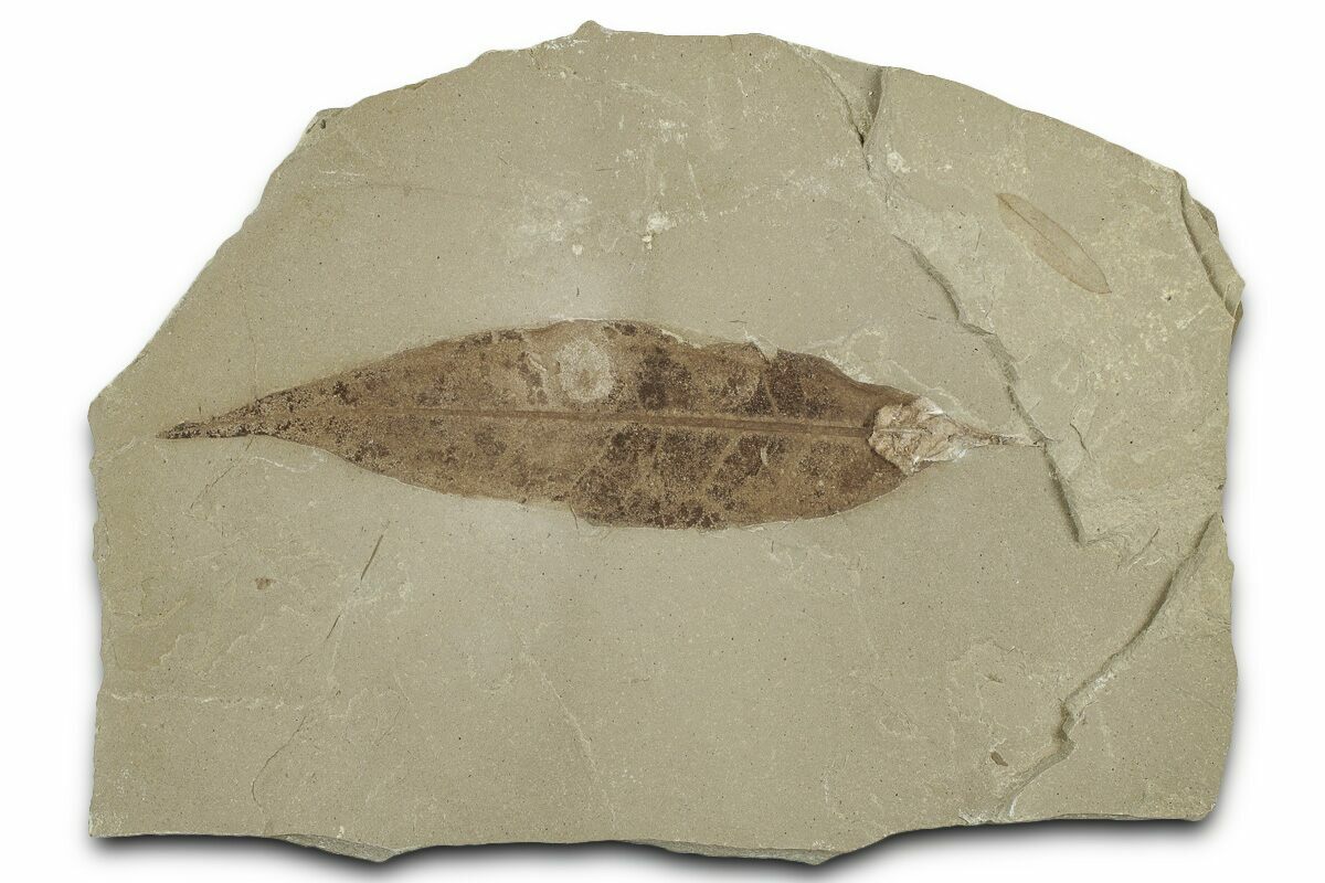 This is a 4.7" wide slab of shale containing two fossil leaves. The largest (unidentified) measures 3.2" long, preserved alongside a .6" long mimosite (Mimosites coloradensis) leaf. This specimen was collected from the Green River Formation in Utah.