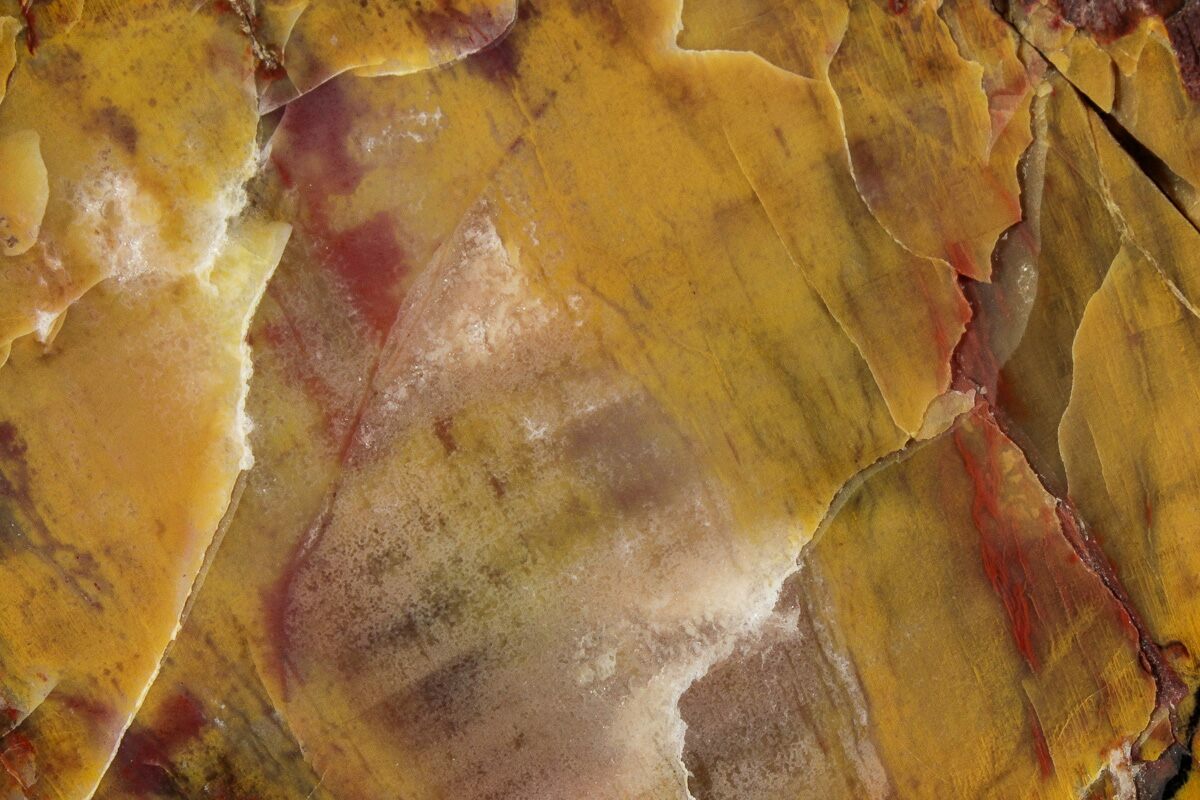 This is a brilliantly colored, 4.7" wide section of petrified wood (Araucarioxylon) from Arizona. One side of the petrified has been polished to a glossy finish, while the exterior surface has a natural texture.