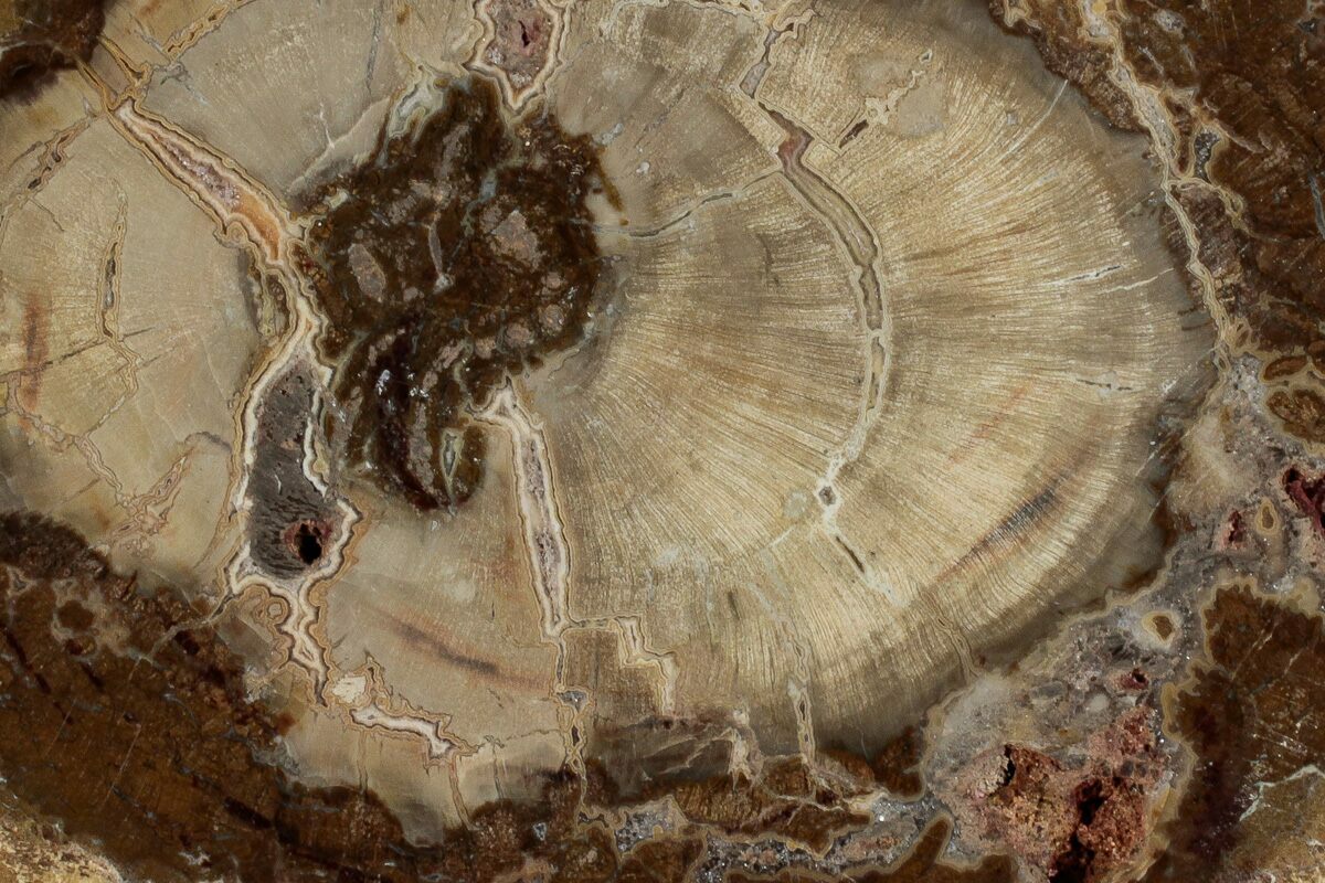 Madagascar petrified wood comes primarily from extensive Triassic-aged deposits in the Mahajanga Basin of northwestern Madagascar, where ancient conifer forests—often attributed to species related to Araucarioxylon—were buried by volcanic ash and floodplain sediments roughly 225–240 million years ago. Over immense spans of time, silica-rich fluids percolated through these sediments, replacing the cellular structure of the wood with chalcedony, jasper, agate, and quartz while preserving growth rings, bark textures, and even microscopic details. The region’s unique geochemistry—especially its iron, manganese, and occasionally copper content—produces the vivid palette Madagascar petrified wood is famous for, including deep brick reds, golden yellows, smoky blacks, and pastel pinks. Many logs are found fully silicified and naturally fractured into large, rounded segments that local artisans cut into slabs, spheres, eggs, and freeforms. These deposits stretch across arid badlands where erosion steadily exposes new material, making Madagascar one of the world’s premier sources of highly colorful, beautifully patterned fossil wood.