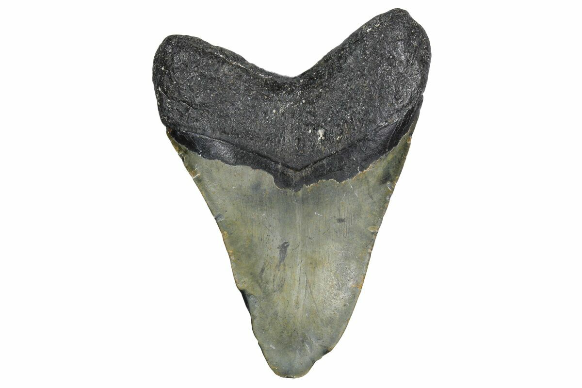 This is a 4.70" long megalodon tooth collected on the North Carolina coast. It was found by commercial divers collecting "the ledges" in about 100 feet of water. It would have eroded out of the Pungo River Formation, putting its age in the range of 13.8 to 16 million years old. A tooth of this size would have come from a prehistoric, mega-shark in the 35+ foot size range.
