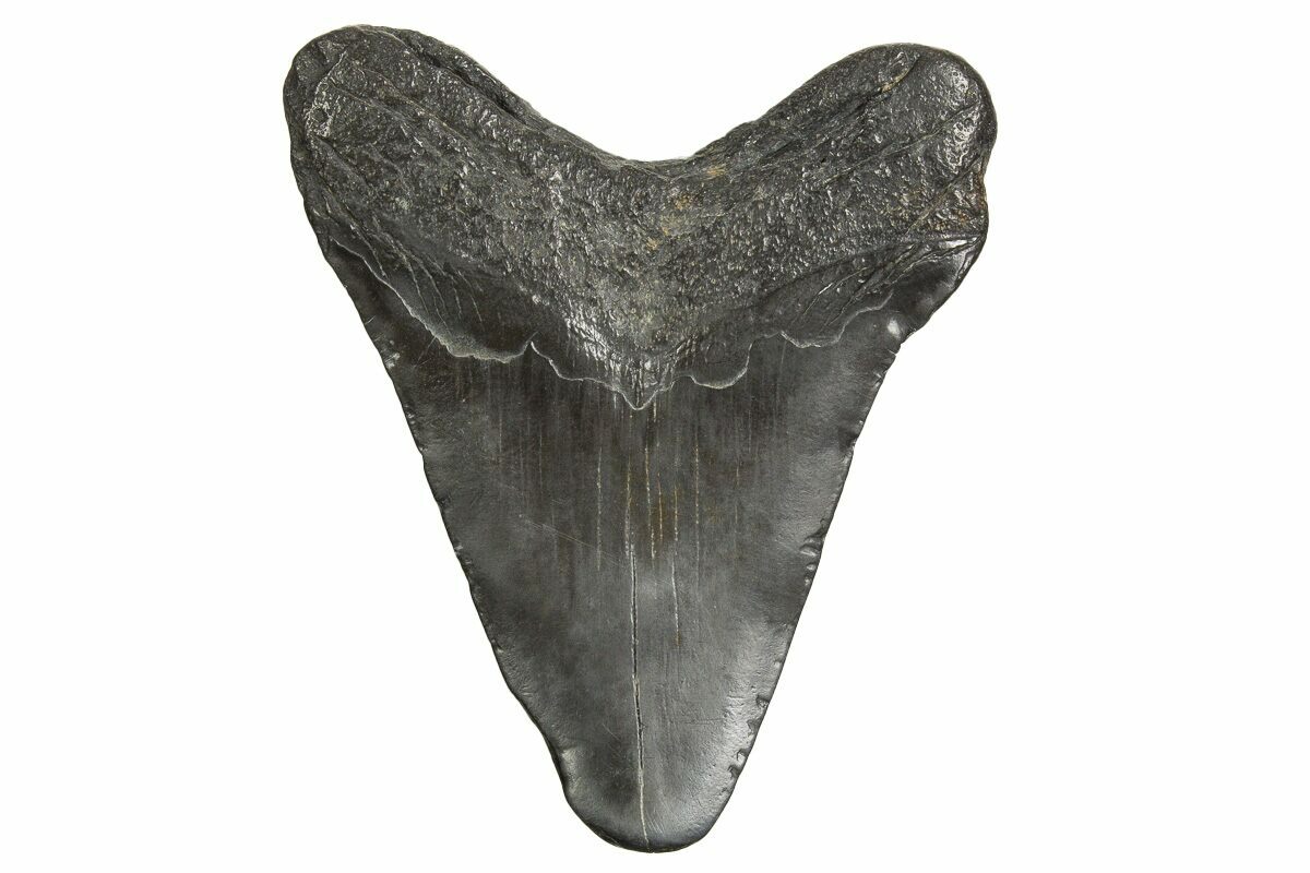 This is a 4.71" long, fossil megalodon tooth collected in South Carolina. The tooth would have come from an adult, prehistoric, mega-shark in the 35+ foot size range. The serrations are worn, but many are still visible.