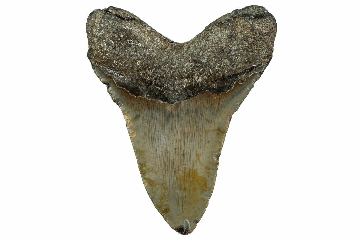 The standard measure for megalodon teeth is slant height, or the longest edge of the tooth. Adult megalodon teeth were typically in the 4 to 5 inch range: teeth over 6 inches are rare and represent super-sized individuals. Only a handful of teeth have ever been found over seven inches.