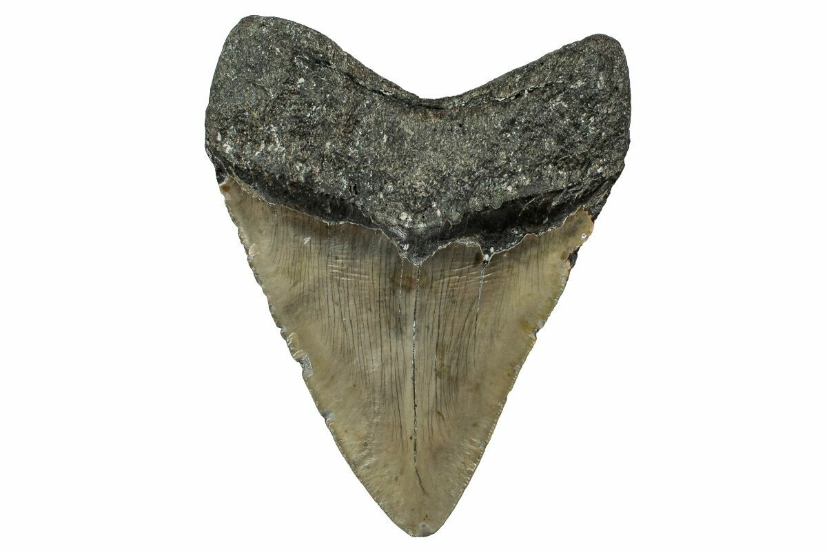 This is a 4.73" long megalodon tooth collected on the North Carolina coast. It was found by commercial divers collecting "the ledges" in about 100 feet of water. It would have eroded out of the Pungo River Formation, putting its age in the range of 13.8 to 16 million years old. A tooth of this size would have come from a prehistoric, mega-shark in the 35+ foot size range.