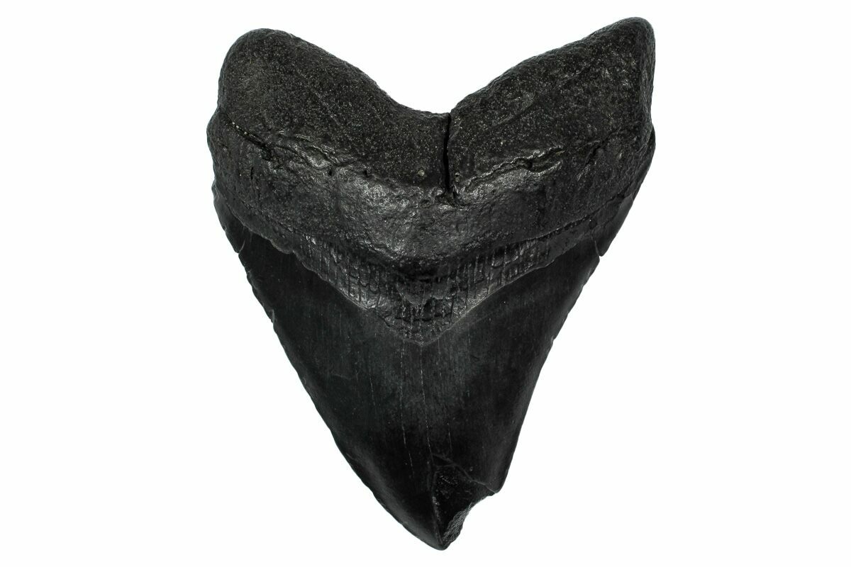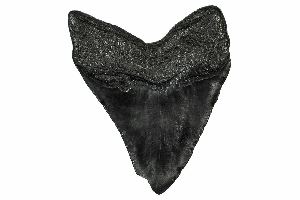This is a 4.73" long, fossil megalodon tooth collected in South Carolina. The tooth would have come from an adult, prehistoric, mega-shark in the 35+ foot size range.