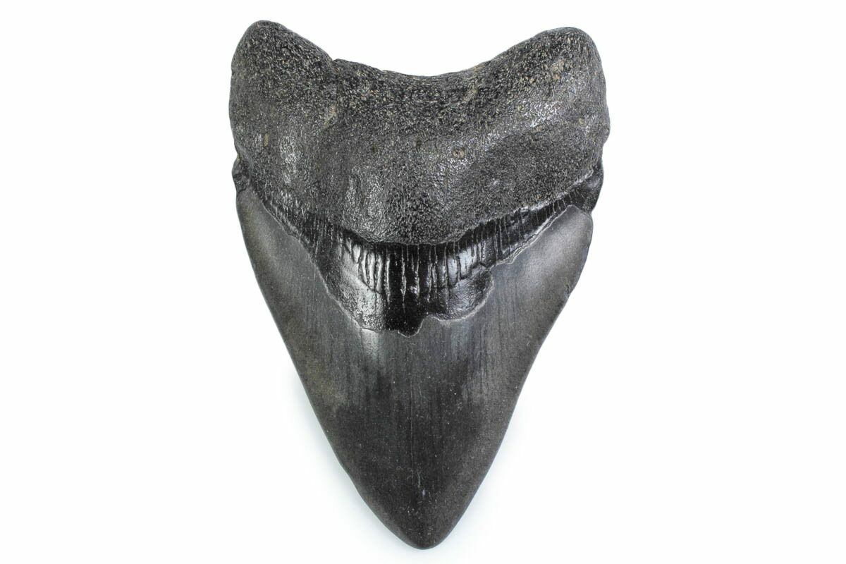 This is a 4.74" long fossil megalodon tooth collected from the Savannah River area along the border of Georgia and South Carolina. The tooth would have come from an adult, prehistoric, mega-shark in the 35+ foot size range.