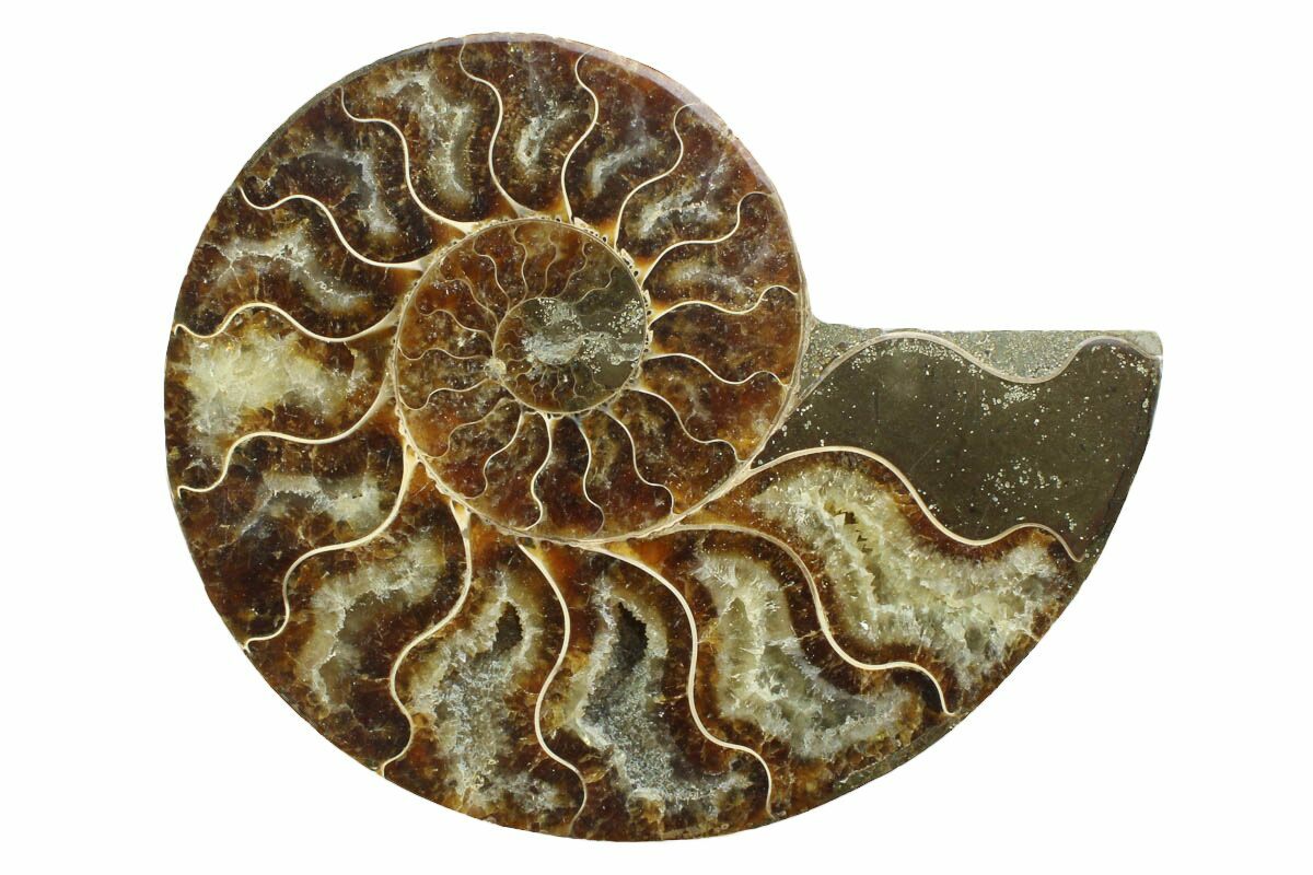 Here is a beautiful, 4.75" wide, cut and polished Cleoniceras ammonite fossil from Madagascar. These ammonites are Cretaceous in age, approximately 110 million years old. This specimen exhibits gorgeous mineralization within the chambers, each separated by white calcite septa (divisions). This highly polished, exotic ammonite makes a superb display piece with tremendous historical appeal.