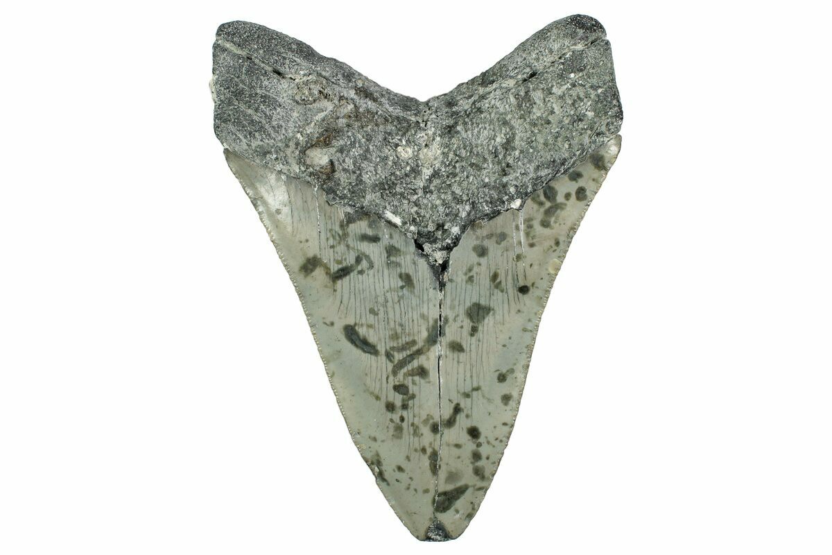 The standard measure for megalodon teeth is slant height, or the longest edge of the tooth. Adult megalodon teeth were typically in the 4 to 5 inch range: teeth over 6 inches are rare and represent super-sized individuals. Only a handful of teeth have ever been found over seven inches.