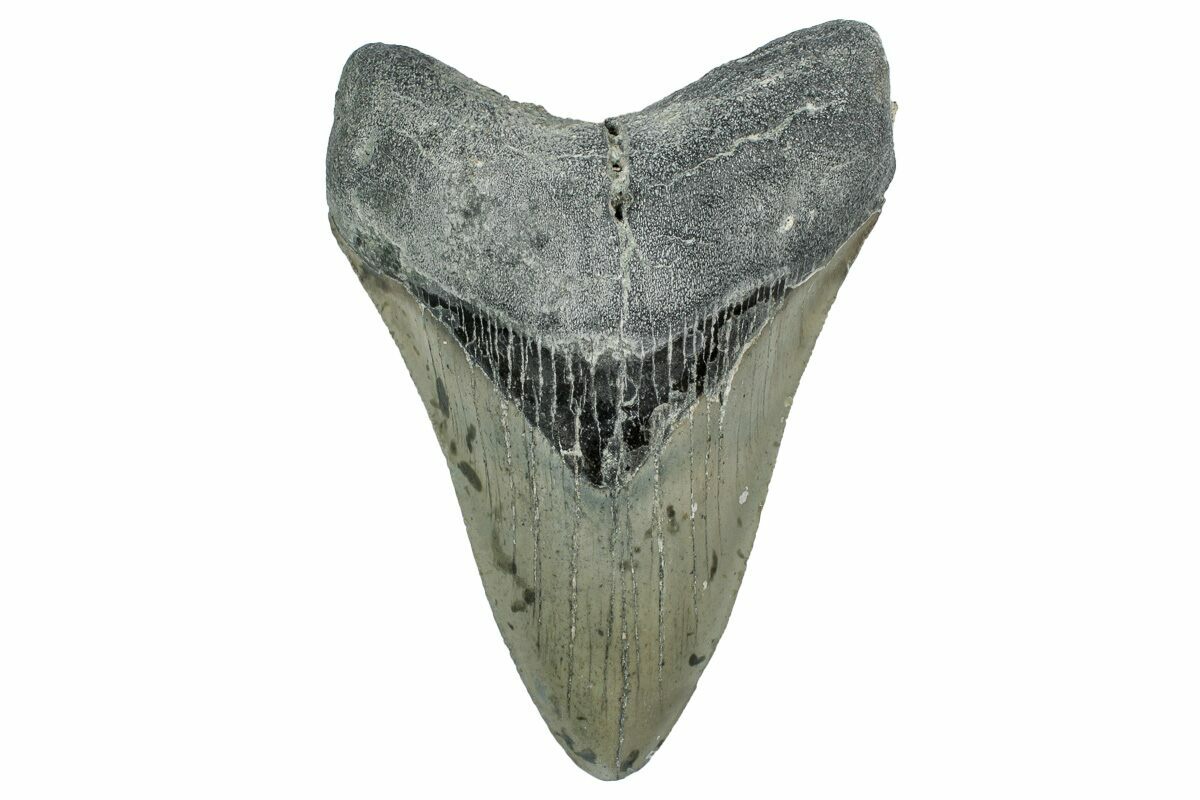 This is a 4.75" long megalodon tooth collected on the North Carolina coast. It was found by commercial divers collecting "the ledges" in about 100 feet of water. It would have eroded out of the Pungo River Formation, putting its age in the range of 13.8 to 16 million years old. A tooth of this size would have come from a prehistoric, mega-shark in the 35+ foot size range.