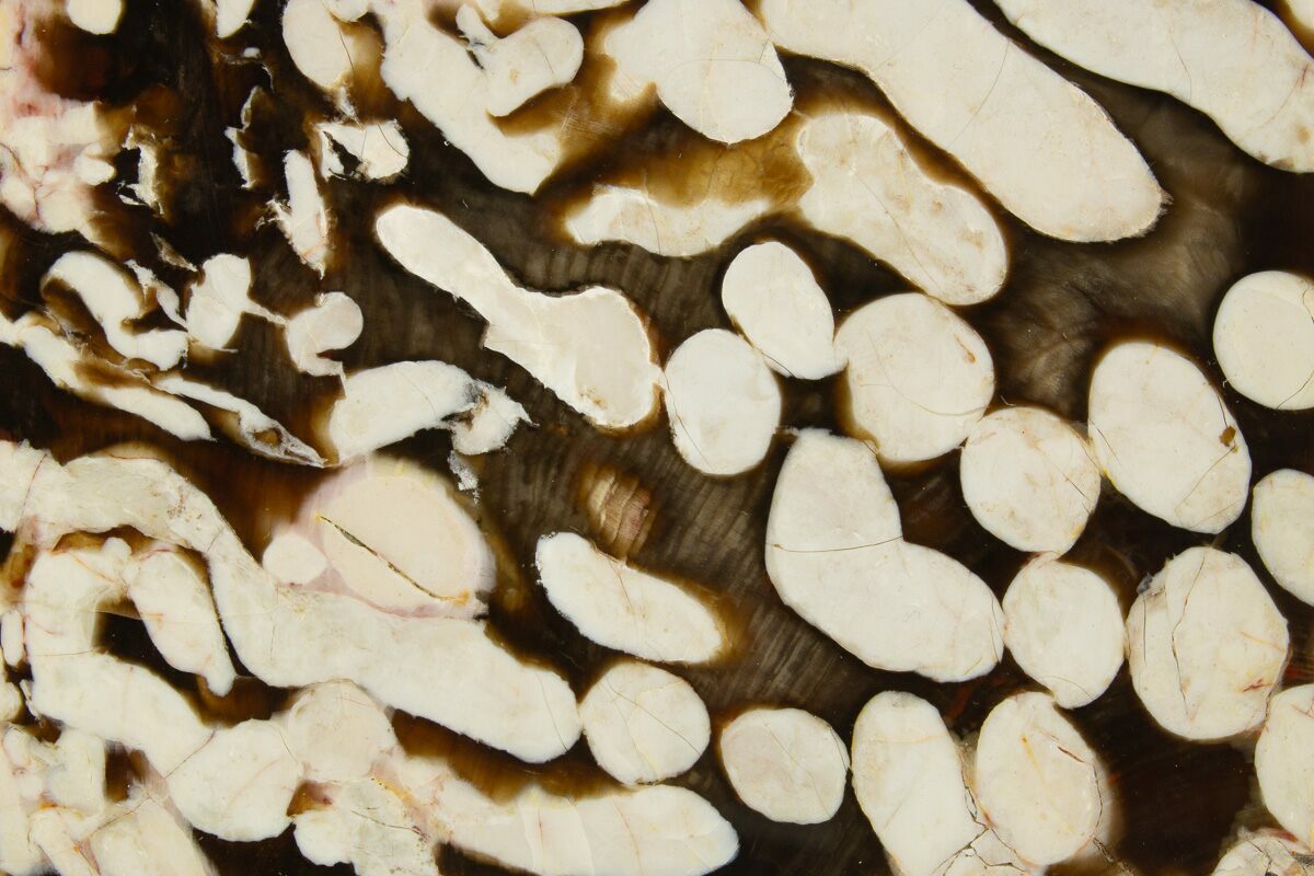 Petrified peanut wood from Australia is one of the most distinctive forms of fossilized wood, instantly recognizable by its bold white “peanut-shaped” spots set within a darker brown to black matrix. These striking patterns aren’t growth rings or mineral veins—they’re the preserved burrows of ancient marine shipworms (Teredo-type clam larvae) that infested the drifting conifer wood roughly 110–120 million years ago. As the wood floated in warm Cretaceous seas, the larvae bored deep, cylindrical tunnels through the soft interior. When the wood eventually sank and became buried in sediment, these empty borings later filled with light-colored minerals such as silica, creating the high-contrast textures that make peanut wood so recognizable and collectible today.