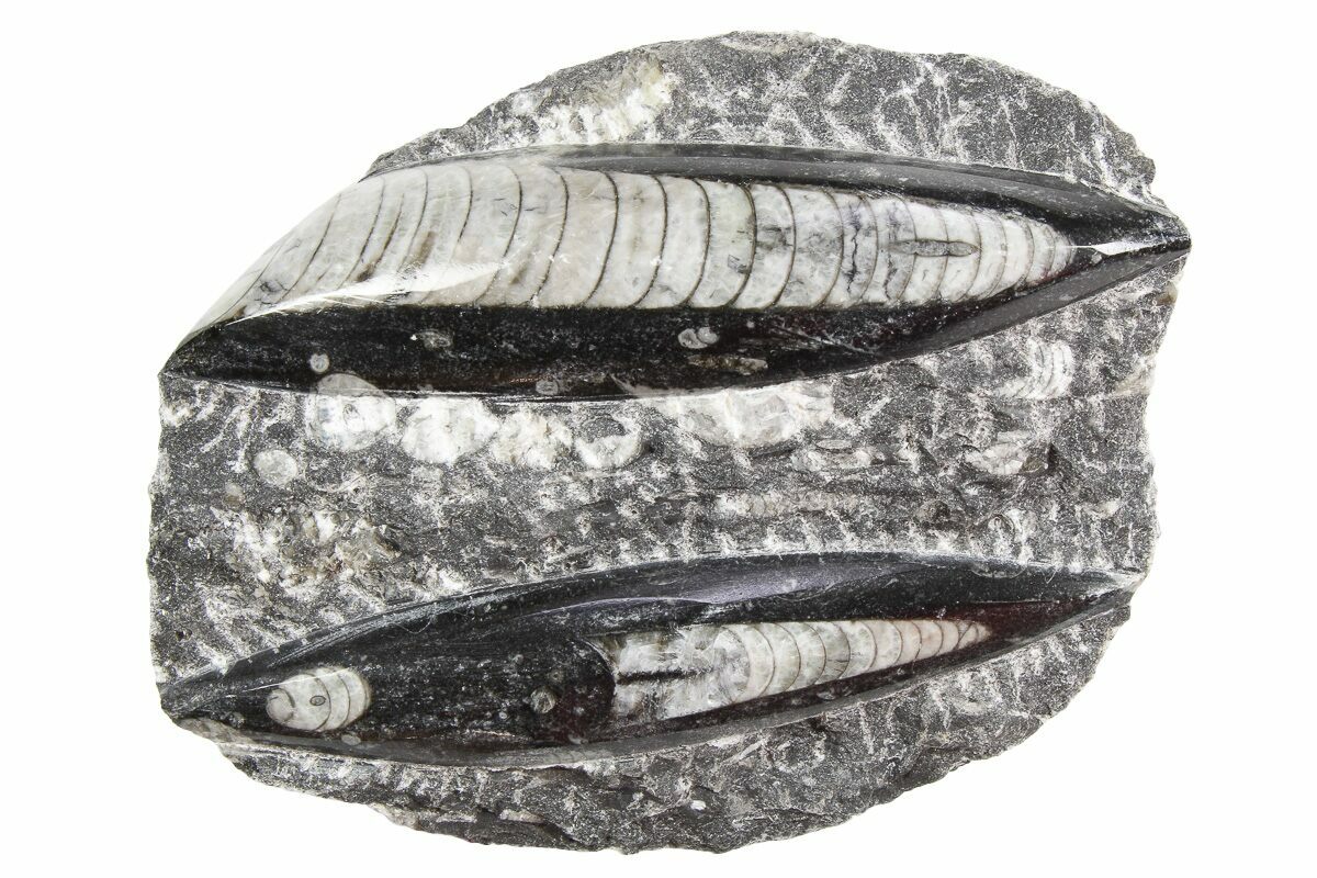 The fossils commonly known as Orthoceras are extinct "straight" cephalopods that lived during the Upper Devonian period around 370 million years ago. Like other cephalopods, they lived inside of their shells, had tentacles they could use to grab food, and used jet propulsion, squirting water to move. The rock containing them is quarried from the Atlas Mountains of Morocco and frequently polished to reveal the fossils and make decorative items with them.