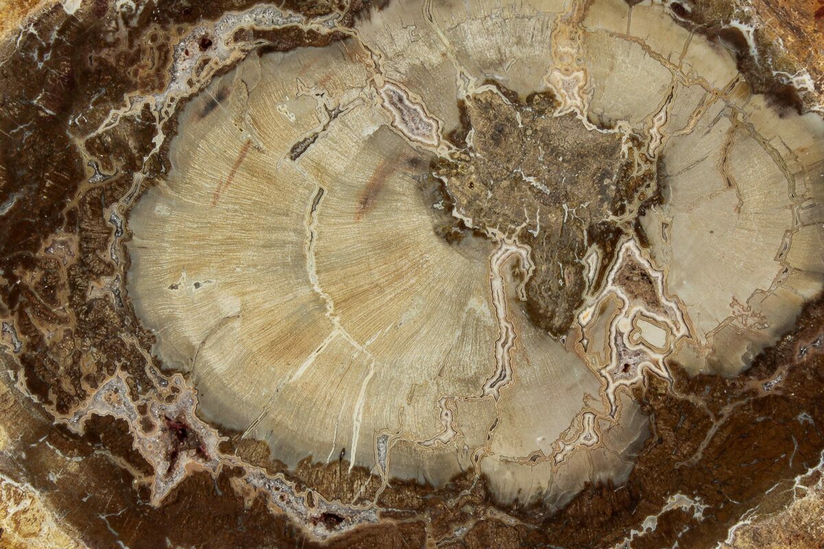 This is a 4.75" wide round of petrified wood (Araucaria) from Ambilobe, Madagascar. Araucaria is a coniferous tree in the family that includes the modern Monkey Puzzle tree. This 220 million year old petrified wood has been sliced and polished on both sides, allowing the stunning inner wood detail and fantastic coloration to easily be seen.