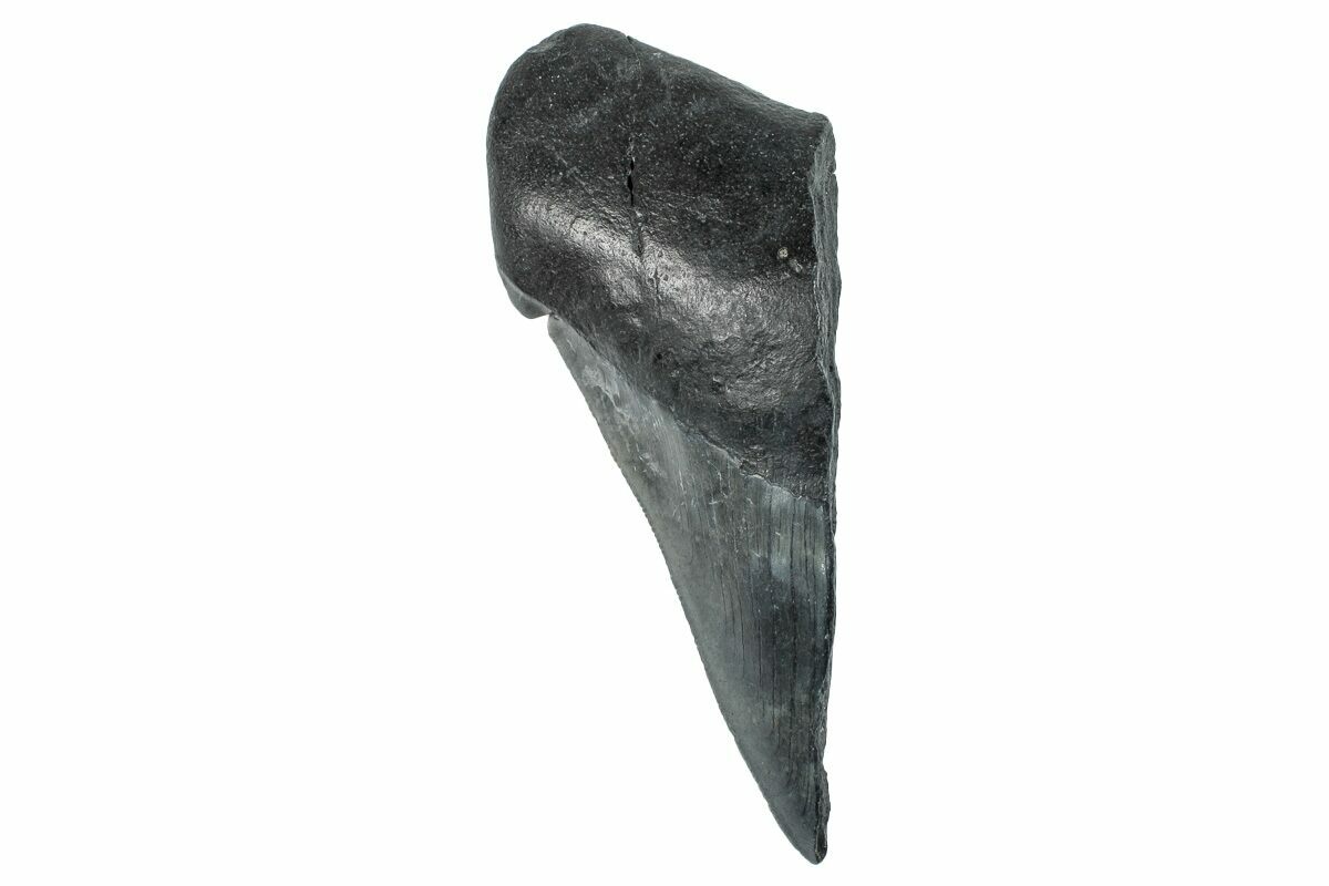 This is half of a fossil megalodon tooth collected from the Hawthorn Formation in South Carolina. Very often teeth are found broken down the middle and are much more common than finding complete unbroken teeth. The tooth would have come from an adult, prehistoric, mega-shark in the 35+ foot size range.