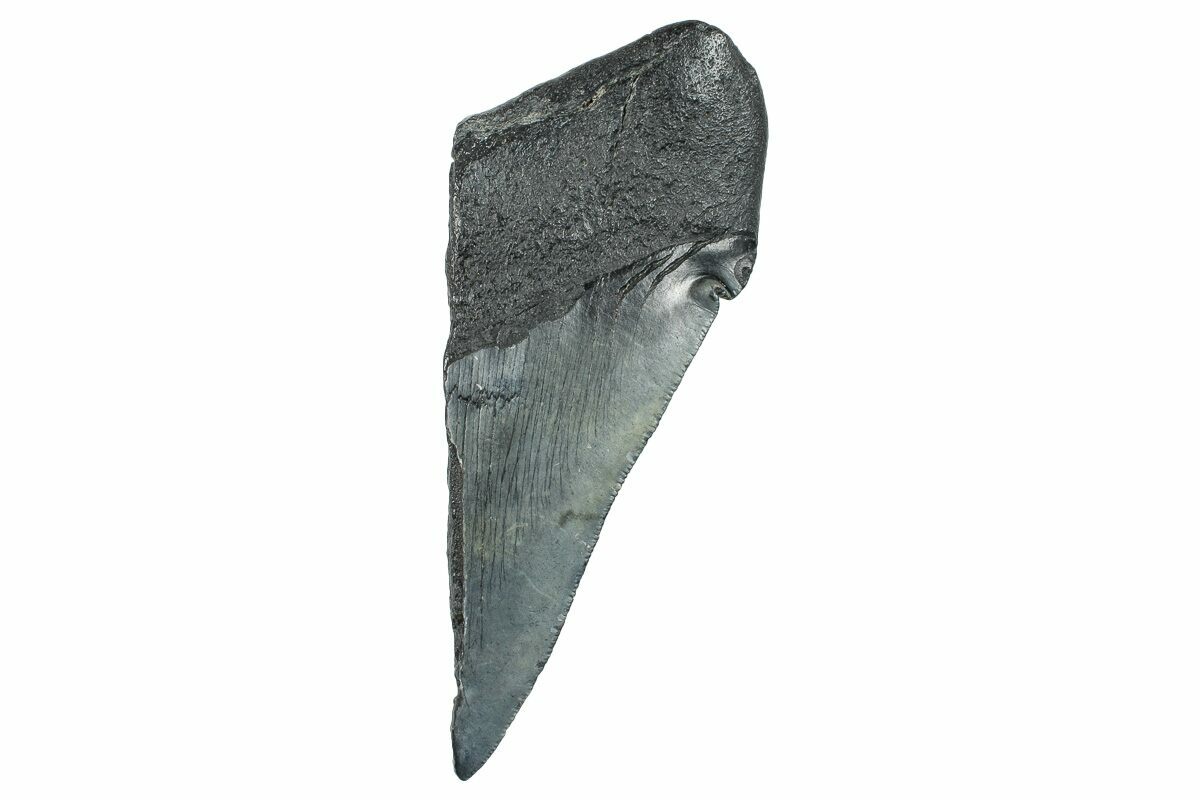 The standard measure for megalodon teeth is slant height, or the longest edge of the tooth. Adult megalodon teeth were typically in the 4 to 5 inch range: teeth over 6 inches are rare and represent super-sized individuals. Only a handful of teeth have ever been found over seven inches.