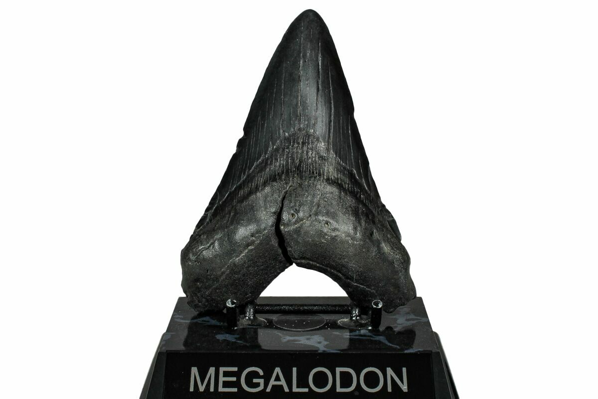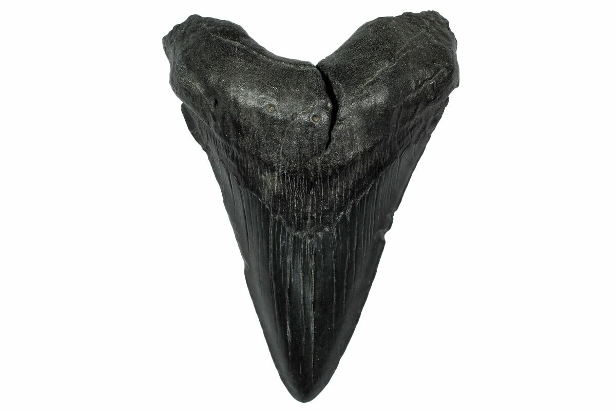 The standard measure for megalodon teeth is slant height, or the longest edge of the tooth. Adult megalodon teeth were typically in the 4 to 5 inch range: teeth over 6 inches are rare and represent super-sized individuals. Only a handful of teeth have ever been found over seven inches.