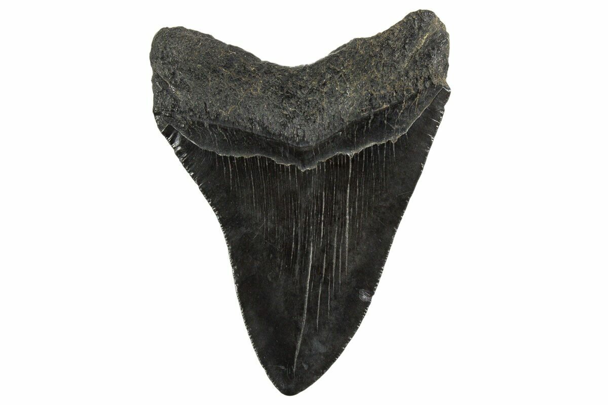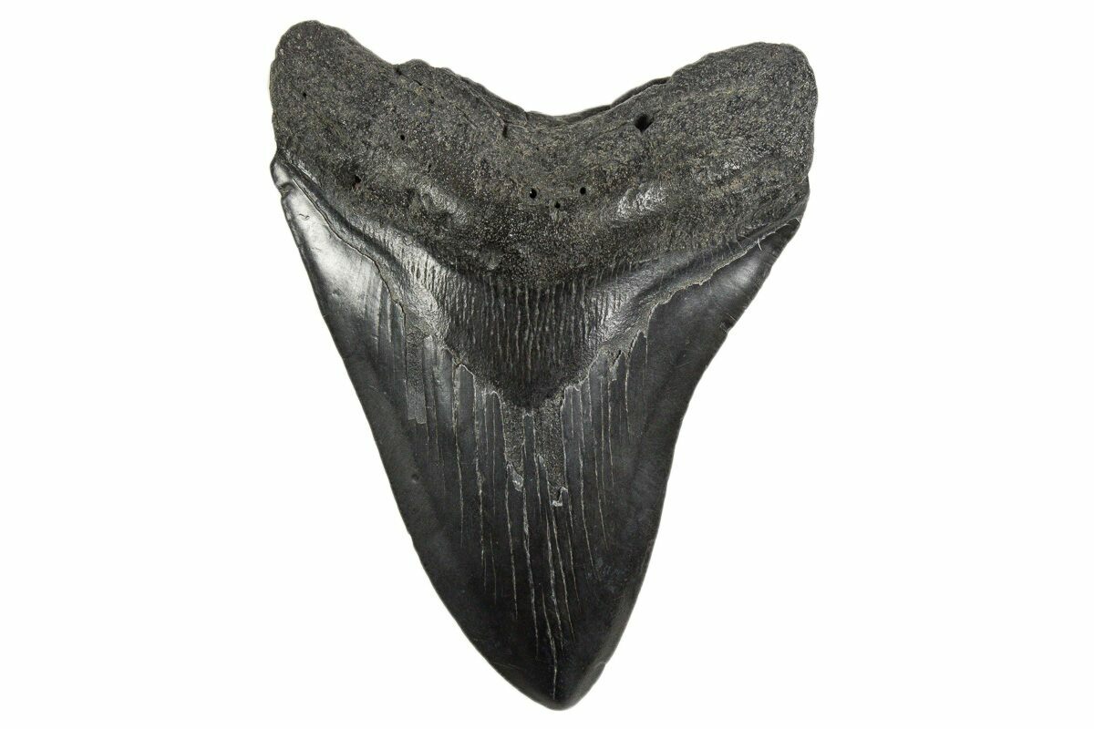 This is a 4.78" long, fossil megalodon tooth collected in South Carolina. The tooth would have come from an adult, prehistoric, mega-shark in the 35+ foot size range. The serrations are worn, but many are still visible.
